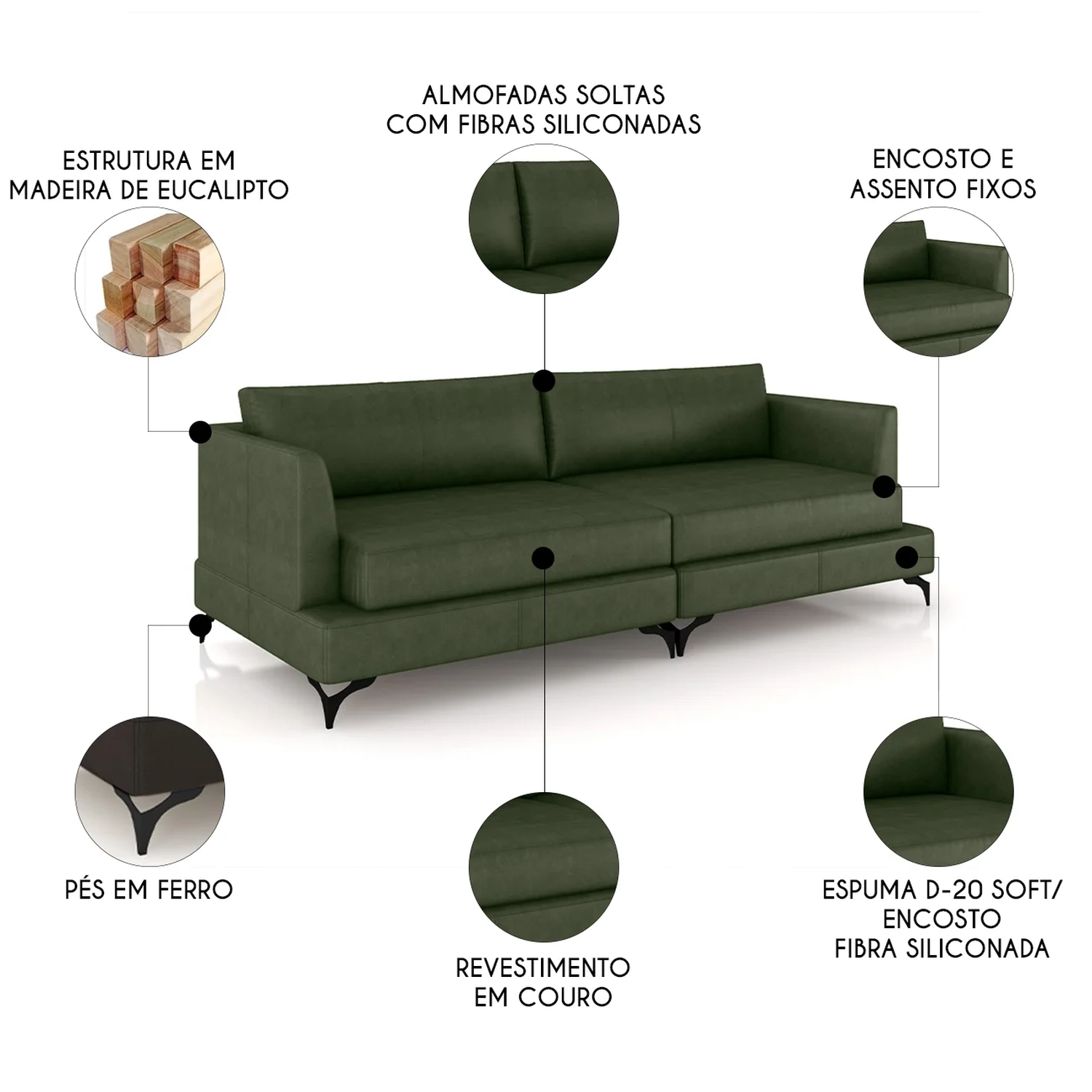 Feito com madeira de eucalipto, o Sofá de Couro oferece uma base robusta e alta durabilidade, perfeito para quem busca um sofá que acompanhe o ritmo do dia a dia.