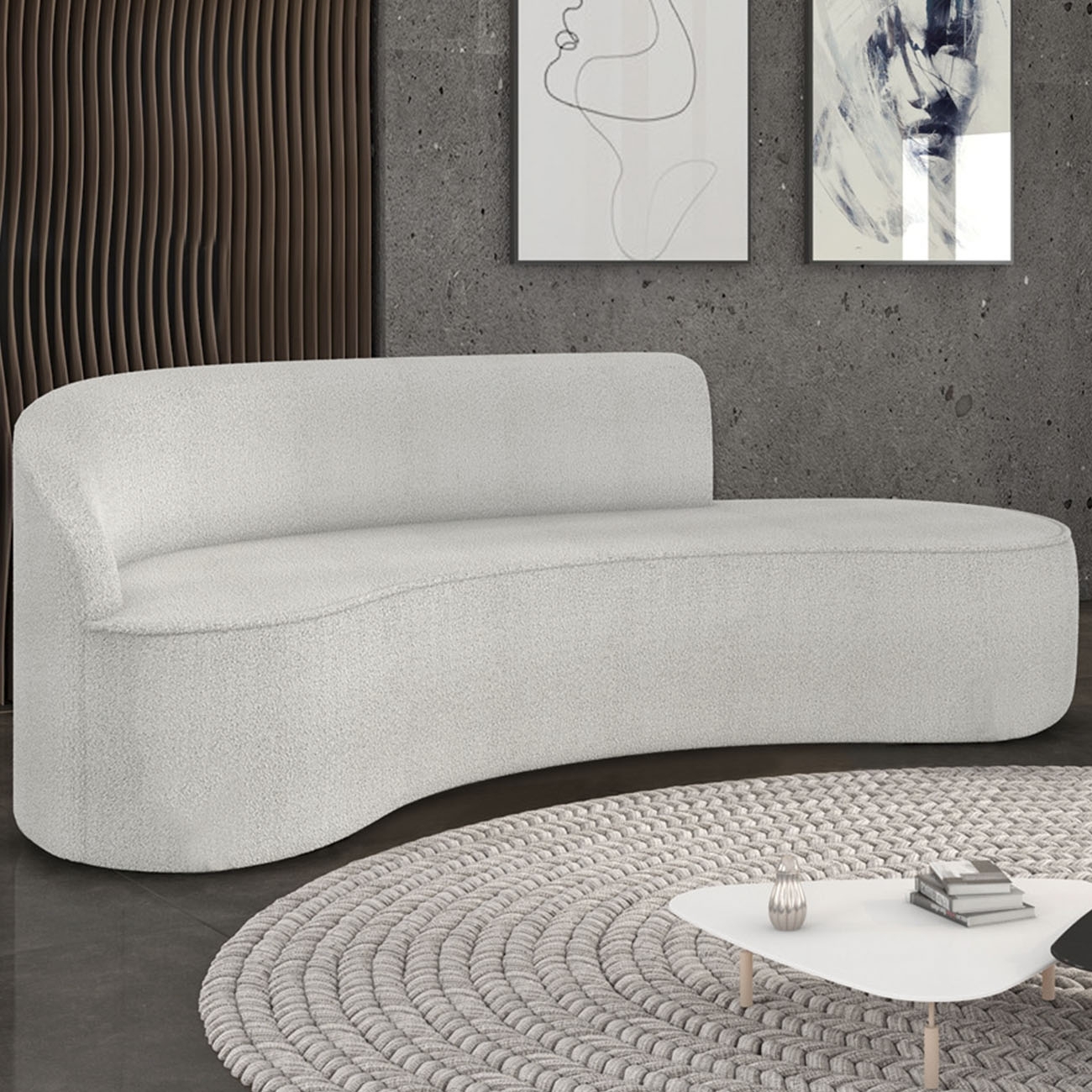 O revestimento em boucle adiciona textura e sofisticação, valorizando ainda mais o design com inspiração nas formas orgânicas da natureza. Ideal para criar um espaço de bem-estar, com Estilo Natural e Sofá Estilo Orgânico.