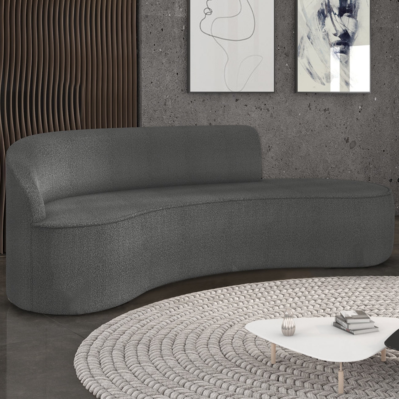 O revestimento em boucle adiciona textura e sofisticação, valorizando ainda mais o design com inspiração nas formas orgânicas da natureza. Ideal para criar um espaço de bem-estar, com Estilo Natural e Sofá Estilo Orgânico.