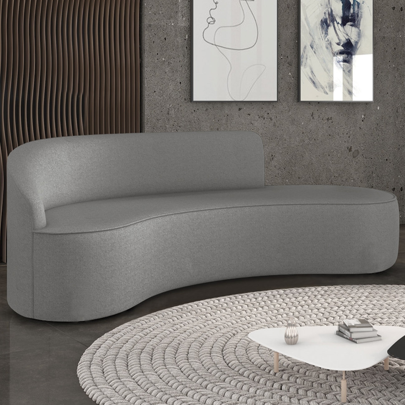 Com formato fluido e curvo, este modelo traz leveza e modernidade ao ambiente, criando um espaço acolhedor e visualmente harmônico. Sua estrutura robusta em madeira de eucalipto com MDF reforça a sensação de segurança e durabilidade no uso diário.