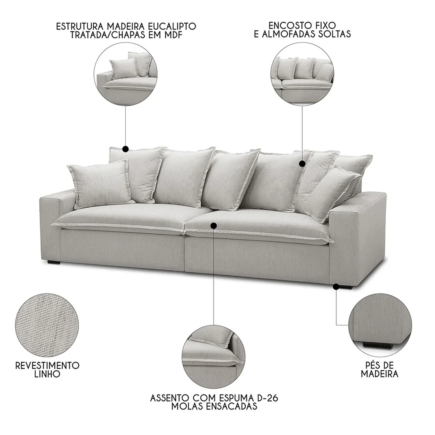 Tipo de Encosto: Fixo/Almofadas Soltas.
