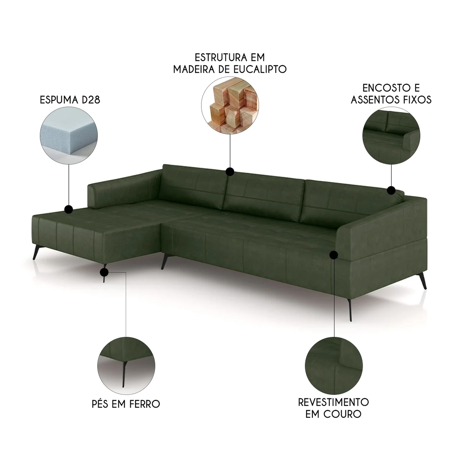 Sofá 5 Lugares 326cm Com Chaise Esquerdo Eko Couro Verde Z55