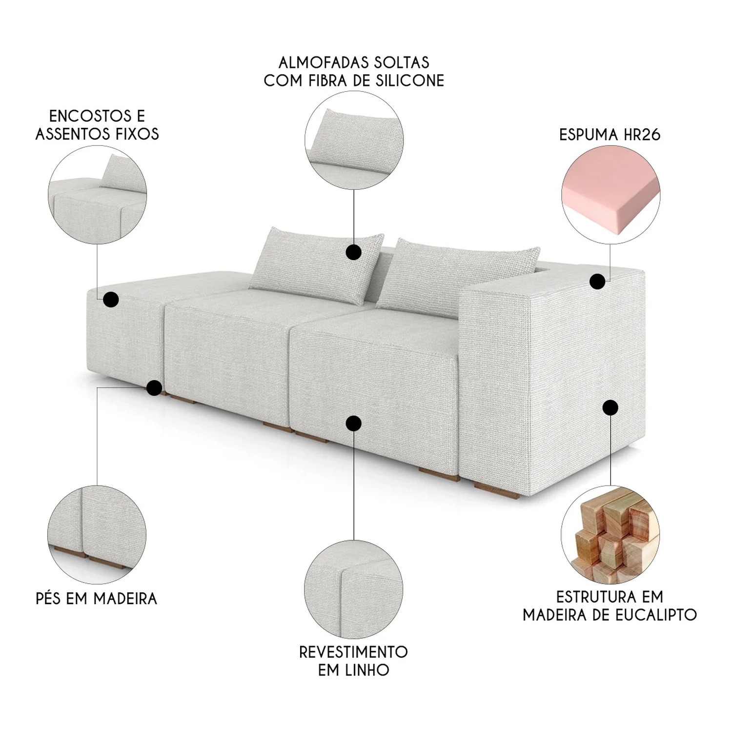 A estrutura em madeira 100% eucalipto garante resistência e longa vida útil. O encosto conta com percintas trançadas e almofadas soltas com fibra de silicone, proporcionando apoio ergonômico e acolhedor na Sala de Estar.