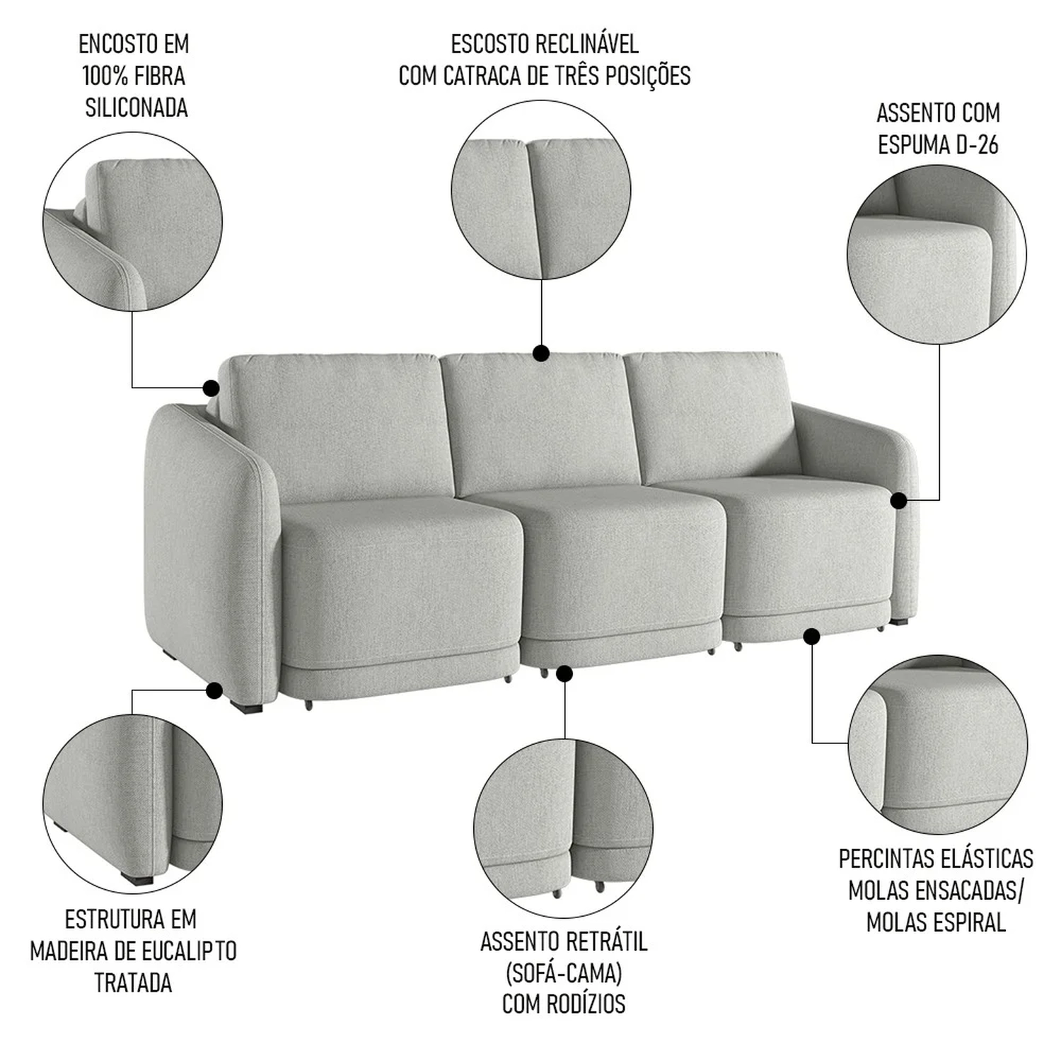 Essa peça impressionante foi projetada para trazer conforto e estilo ao seu espaço, principalmente com o recurso retrátil, em que você pode ajustar facilmente o sofá para atender às suas necessidades de assento, além de aproveitá-lo como cama e acomodar perfeitamente as suas visitas. Isso porque, a espuma D26 garante o máximo de conforto, enquanto o revestimento de alto padrão acrescenta um toque de elegância. Seja para assistir a um filme ou para receber convidados, esse sofá 3 lugares será o complemento perfeito para a sua sala de estar.