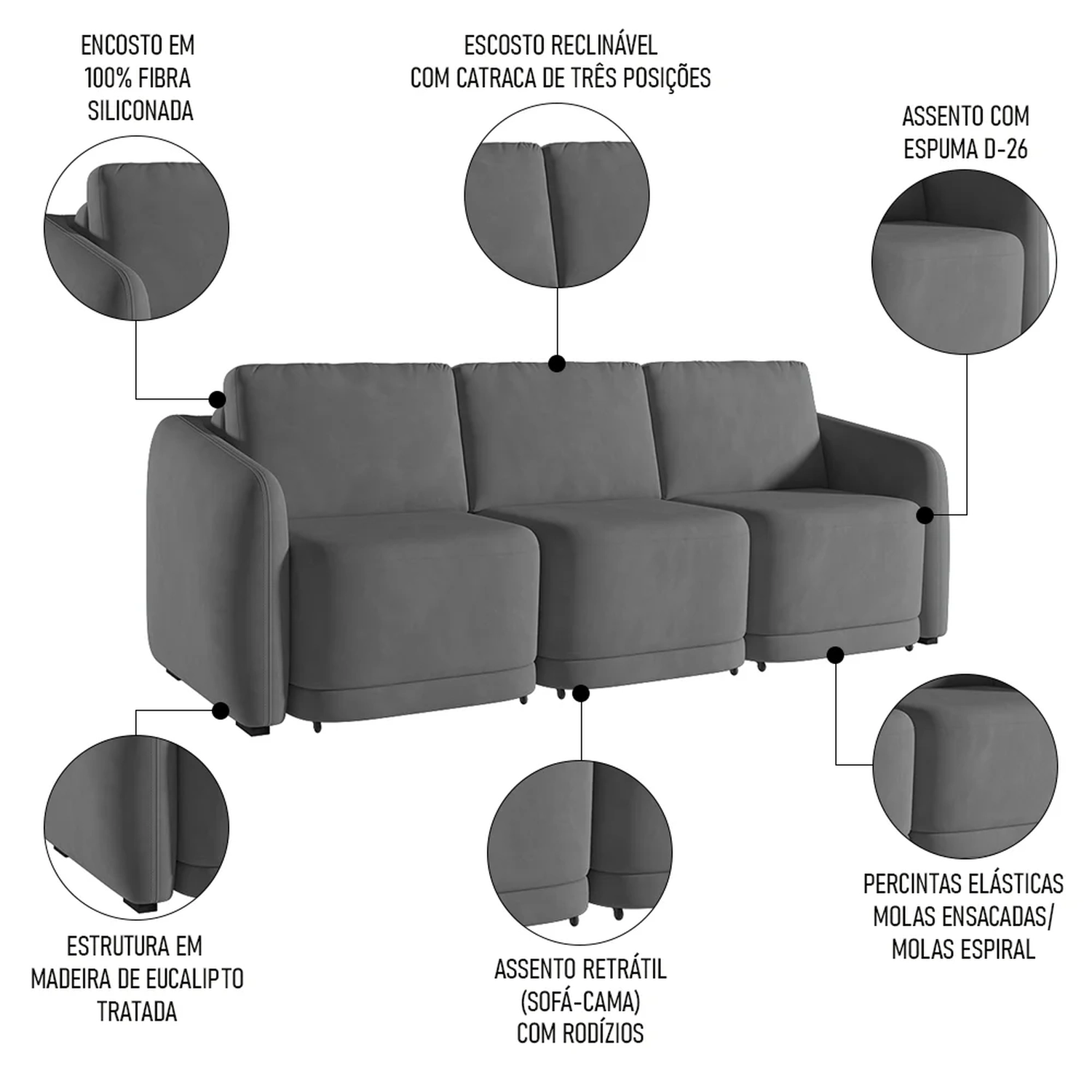 Essa peça impressionante foi projetada para trazer conforto e estilo ao seu espaço, principalmente com o recurso retrátil, em que você pode ajustar facilmente o sofá para atender às suas necessidades de assento, além de aproveitá-lo como cama e acomodar perfeitamente as suas visitas. Isso porque, a espuma D26 garante o máximo de conforto, enquanto o revestimento de alto padrão acrescenta um toque de elegância. Seja para assistir a um filme ou para receber convidados, esse sofá 3 lugares será o complemento perfeito para a sua sala de estar.