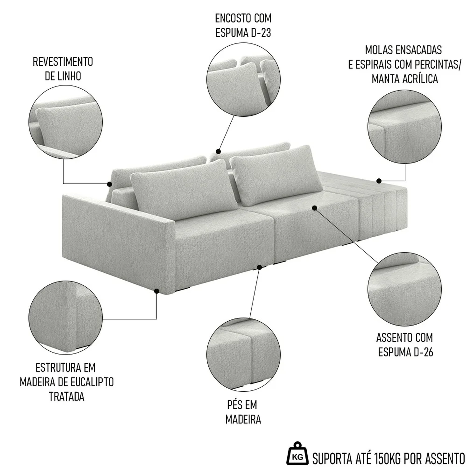 Material do Assento: Espuma D-26/Molas Ensacadas e Espirais com Percintas/Manta Acrílica.