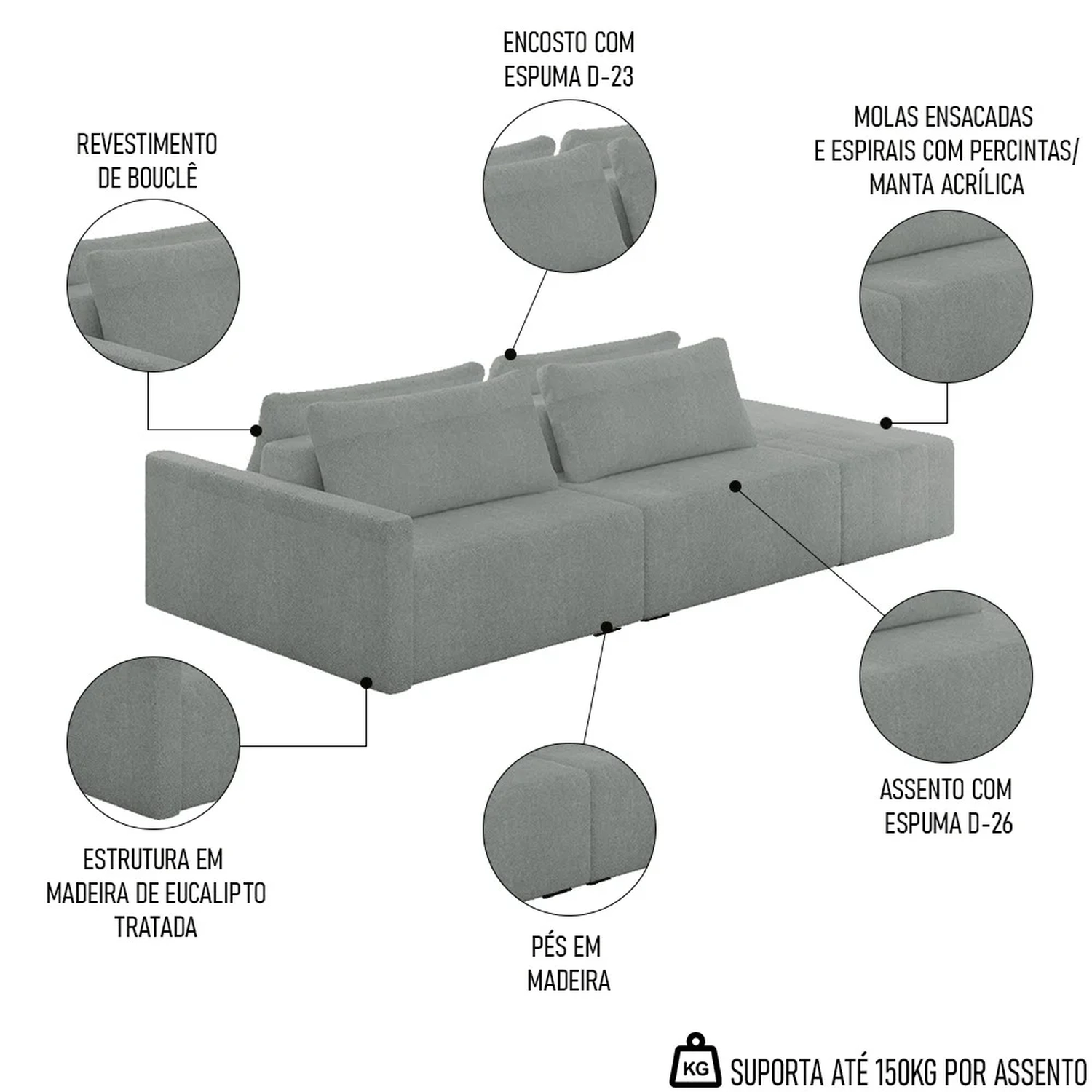 Peso Suportado: 150 kg por assento.