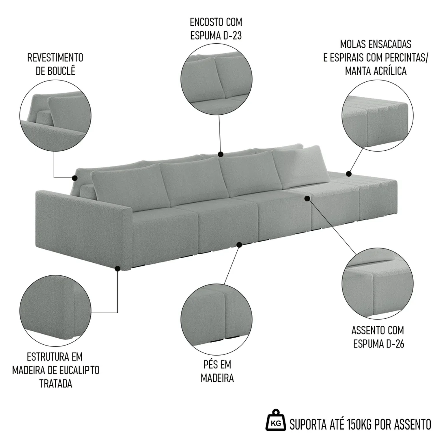 Eleve seu espaço de convivência a novos patamares de luxo com o Sofá Ilha Modular com Puff para Sala Living 392cm Georgia Z08 Boucle Cinza, da Mpozenato!