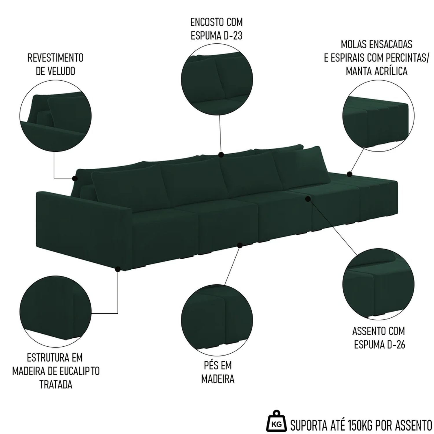 Eleve seu espaço de convivência a novos patamares de luxo com o Sofá Ilha Modular com Puff para Sala Living 392cm Georgia Z08 Veludo Verde, da Mpozenato!