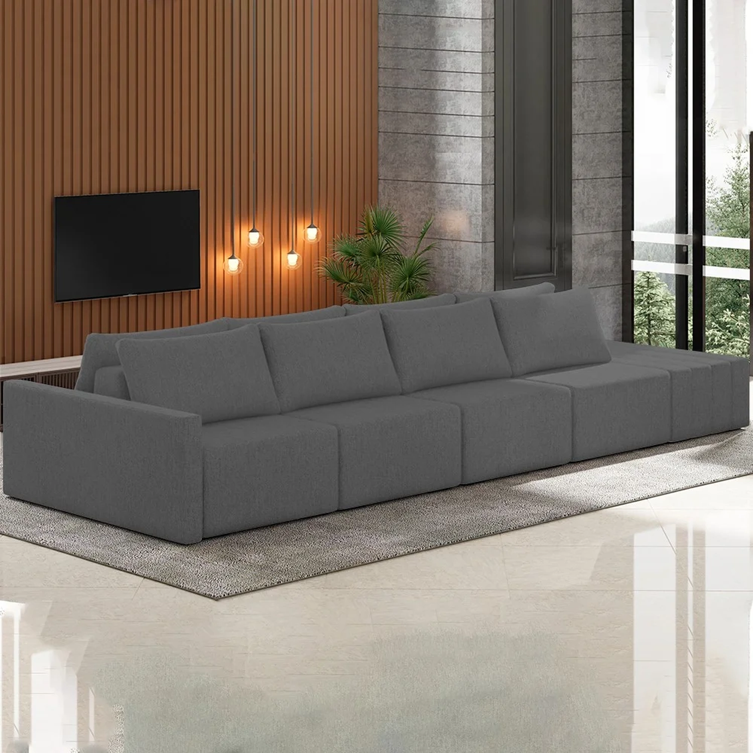 Com seu design modular, você pode personalizar o layout de acordo com sua preferência. Já o encosto móvel acrescenta versatilidade e conforto, permitindo que você relaxe com estilo. Fabricado com altos padrões, esse sofá modular exala elegância e sofisticação, seja na sua sala de estar, em um canto aconchegante ou em ambientes integrados. Enfim, quer esteja organizando uma reunião ou simplesmente relaxando, esse sofá ilha com puff é a peça central perfeita para uma momentos empolgantes.