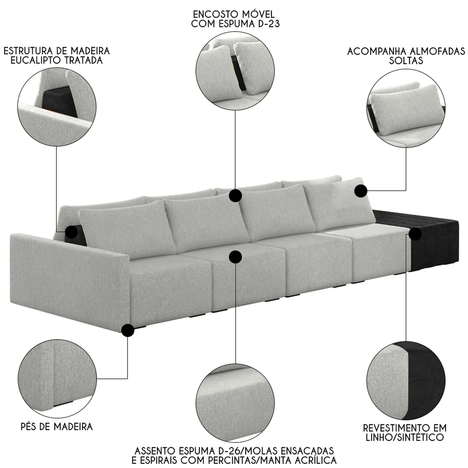 Material do Assento: Espuma D-26/Molas Ensacadas e Espirais com Percintas/Manta Acrílica.