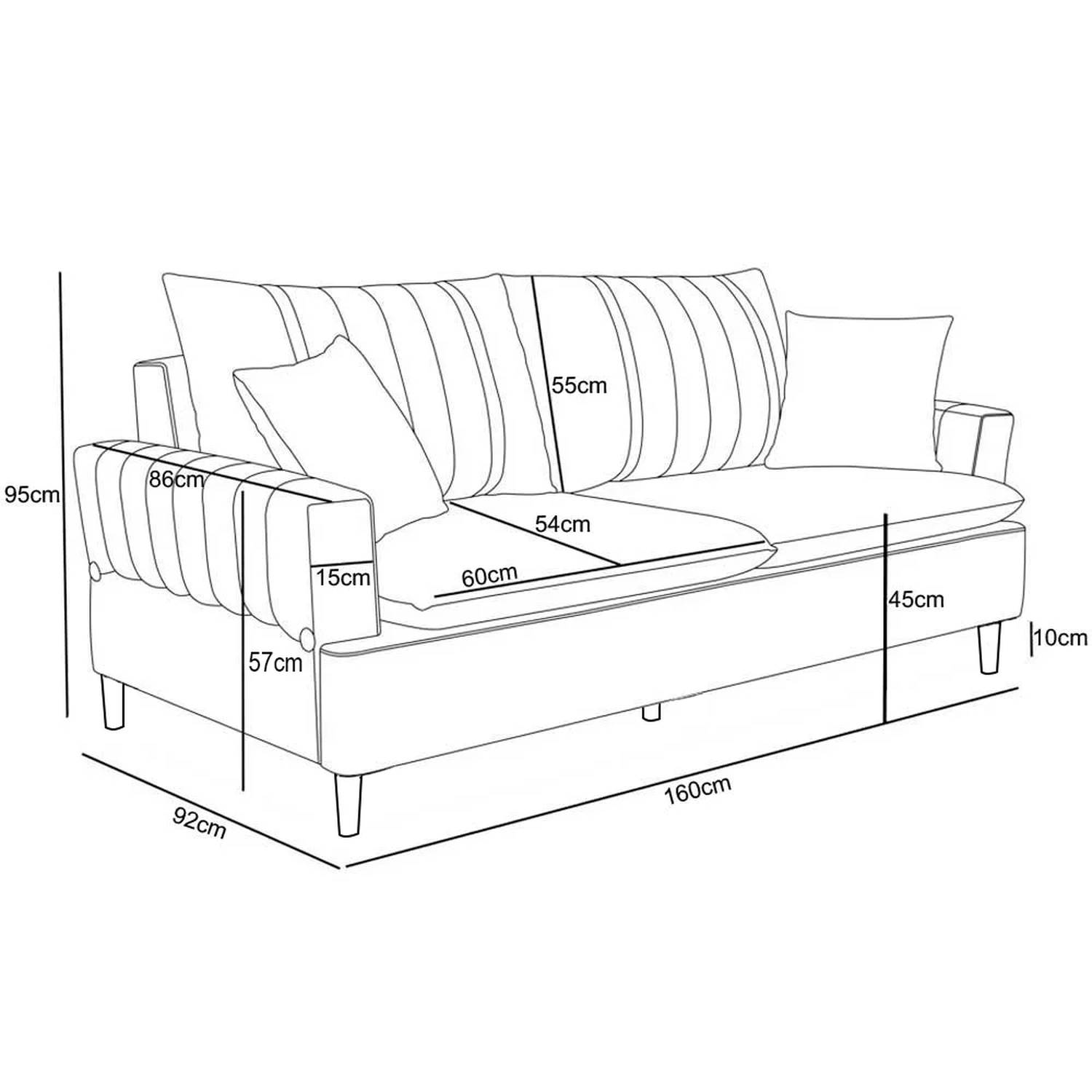 - Encosto e assento com almofadas soltas.