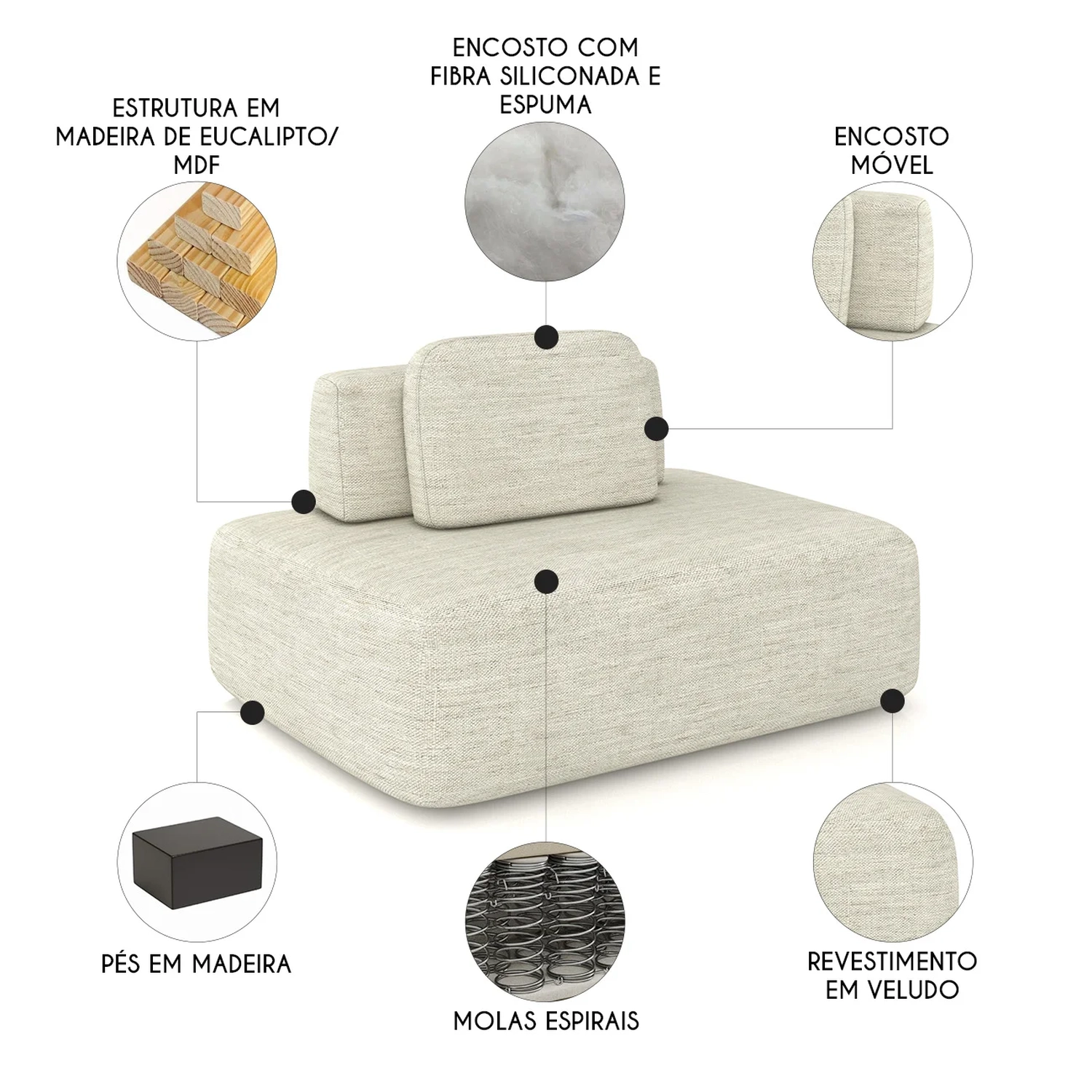 O encosto removível para posicionar como preferir com Almofada Solta é preenchido com fibra siliconada, confortável ao corpo e cria uma experiência relaxante e aconchegante.