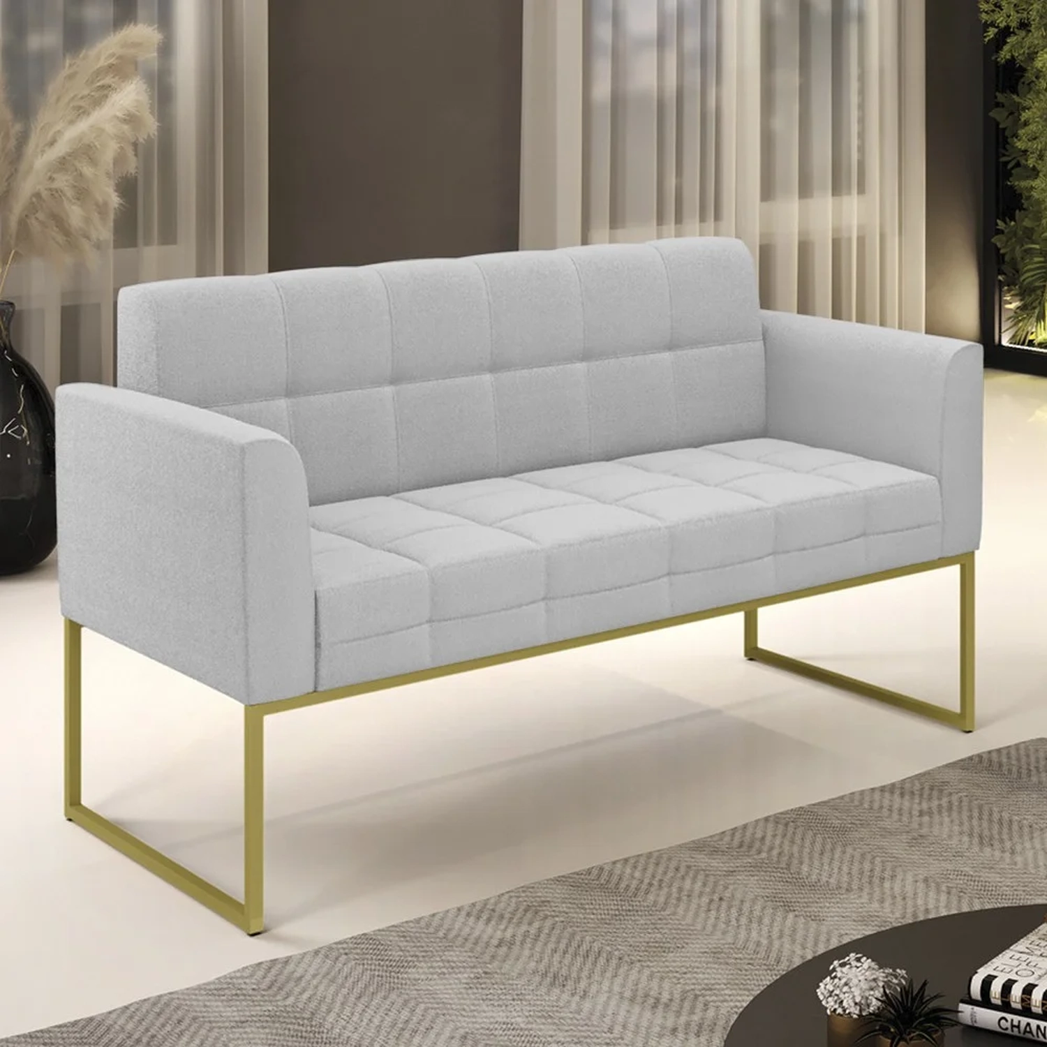 Querida por muitos pela beleza e conforto que proporciona, sua versatilidade dá a liberdade de poder usar na sua Sala De Estar, recepção e onde mais desejar! Você vai adorar o Sofá Namoradeira Base Industrial Dourado Ana Boucle Cinza, da Ibiza!