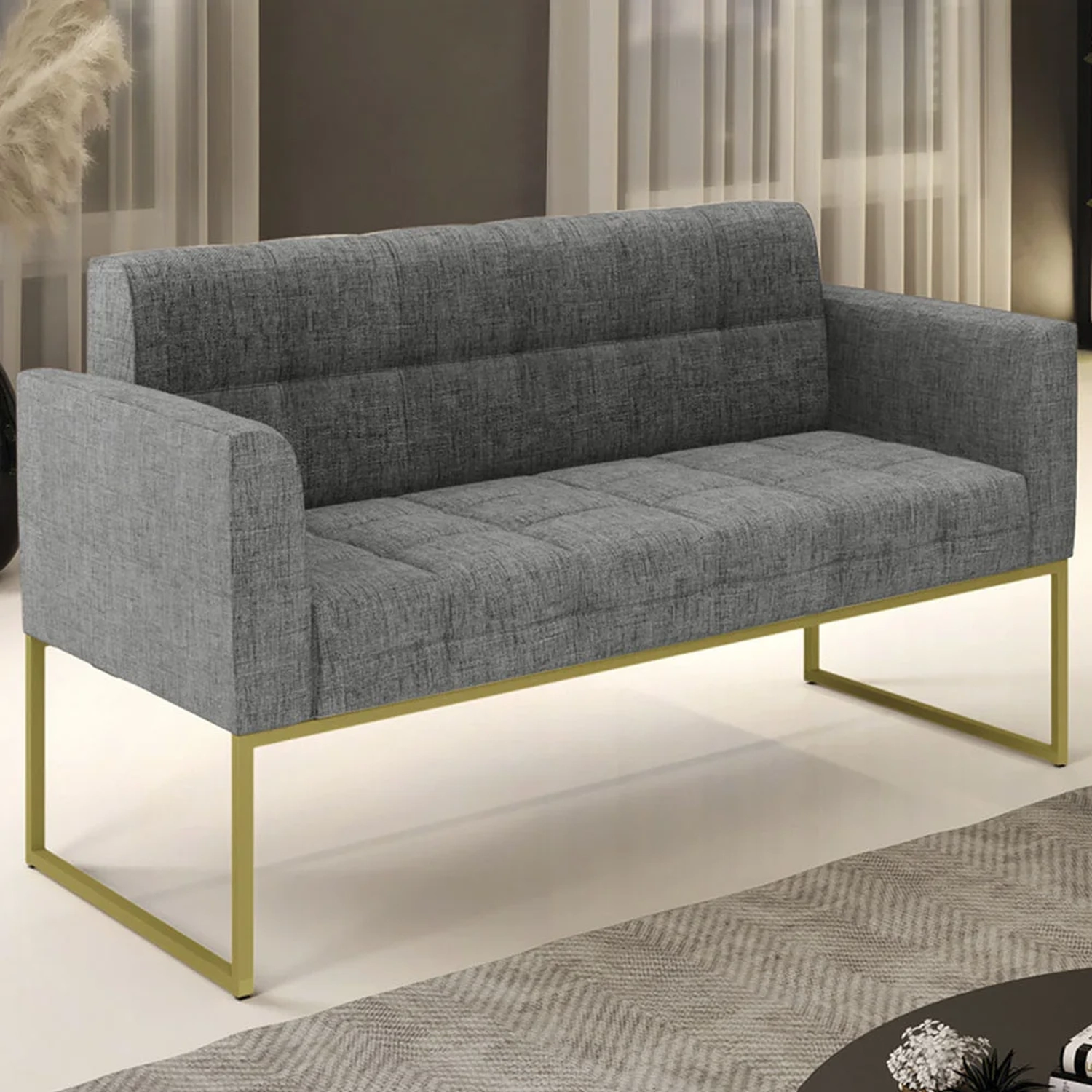 Querida por muitos pela beleza e conforto que proporciona, sua versatilidade dá a liberdade de poder usar na sua Sala De Estar, recepção e onde mais desejar! Você vai adorar o Sofá Namoradeira Base Industrial Dourado Ana Linho Grafite, da Ibiza!