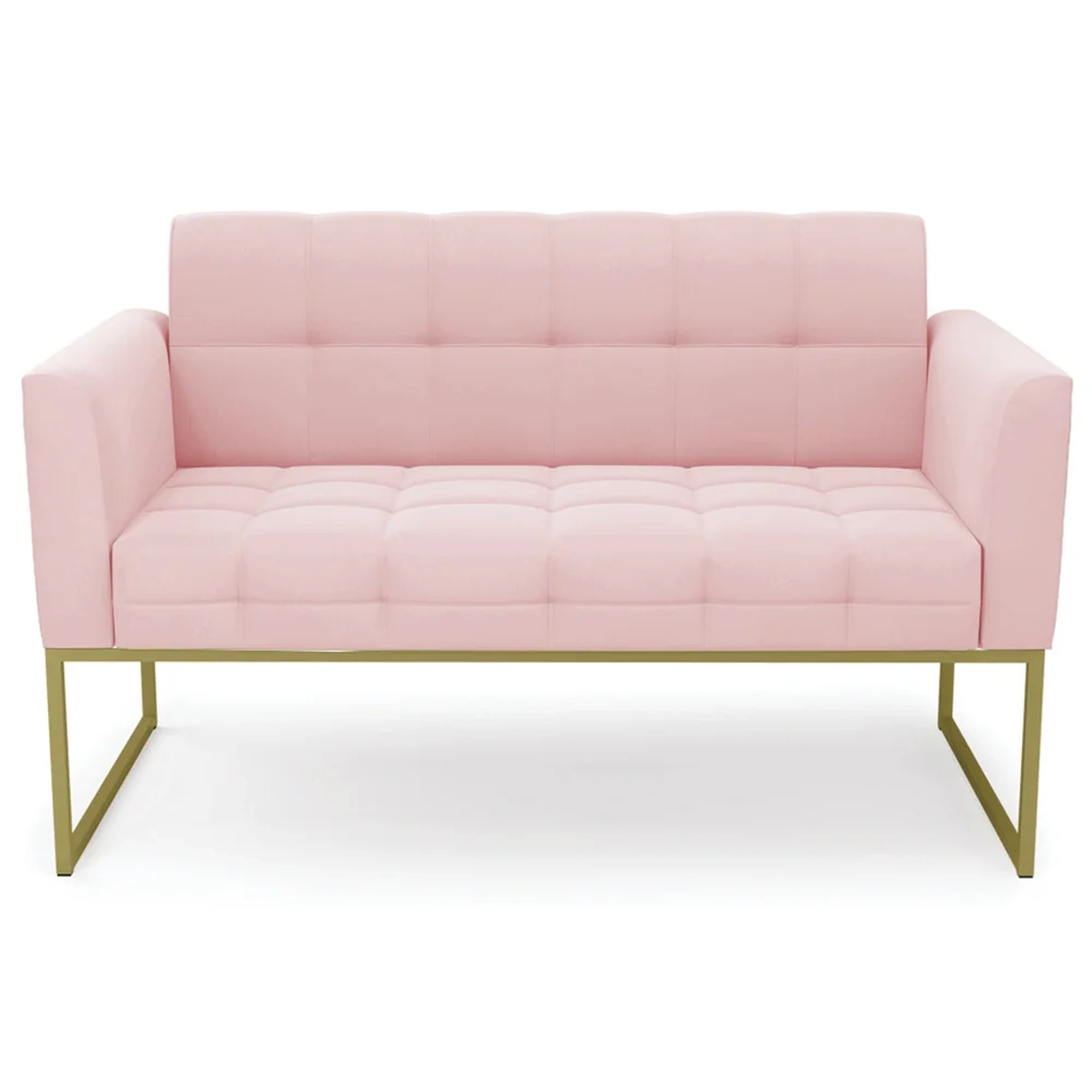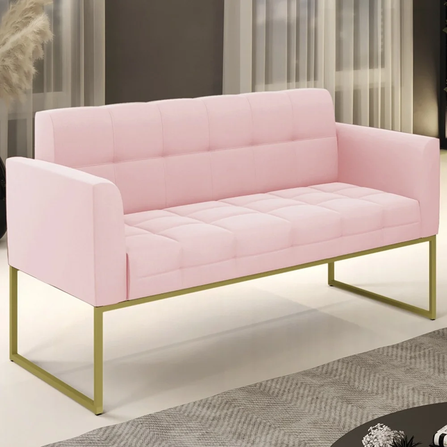 Querida por muitos pela beleza e conforto que proporciona, sua versatilidade dá a liberdade de poder usar na sua Sala De Estar, recepção e onde mais desejar! Você vai adorar o Sofá Namoradeira Base Industrial Dourado Ana Suede Rosa Bebê, da Ibiza!