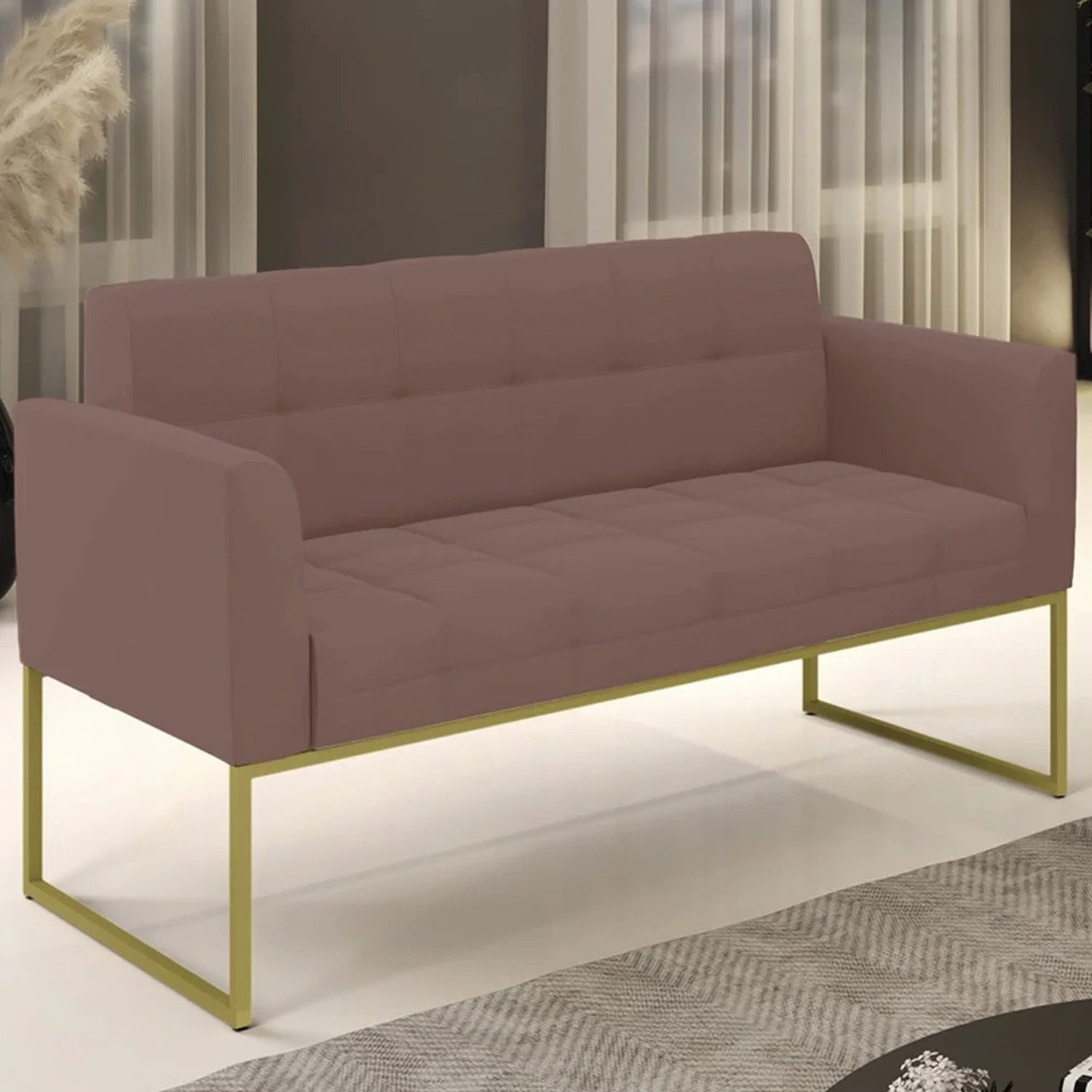 Querida por muitos pela beleza e conforto que proporciona, sua versatilidade dá a liberdade de poder usar na sua Sala De Estar, recepção e onde mais desejar! Você vai adorar o Sofá Namoradeira Base Industrial Dourado Ana Veludo Rosê, da Ibiza!