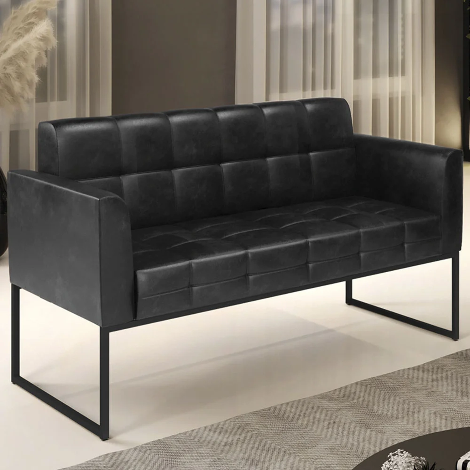 Querida por muitos pela beleza e conforto que proporciona, sua versatilidade dá a liberdade de poder usar na sua Sala De Estar, recepção e onde mais desejar! Você vai adorar o Sofá Namoradeira Base Industrial Preto Ana Sintético PU Preto, da Ibiza!