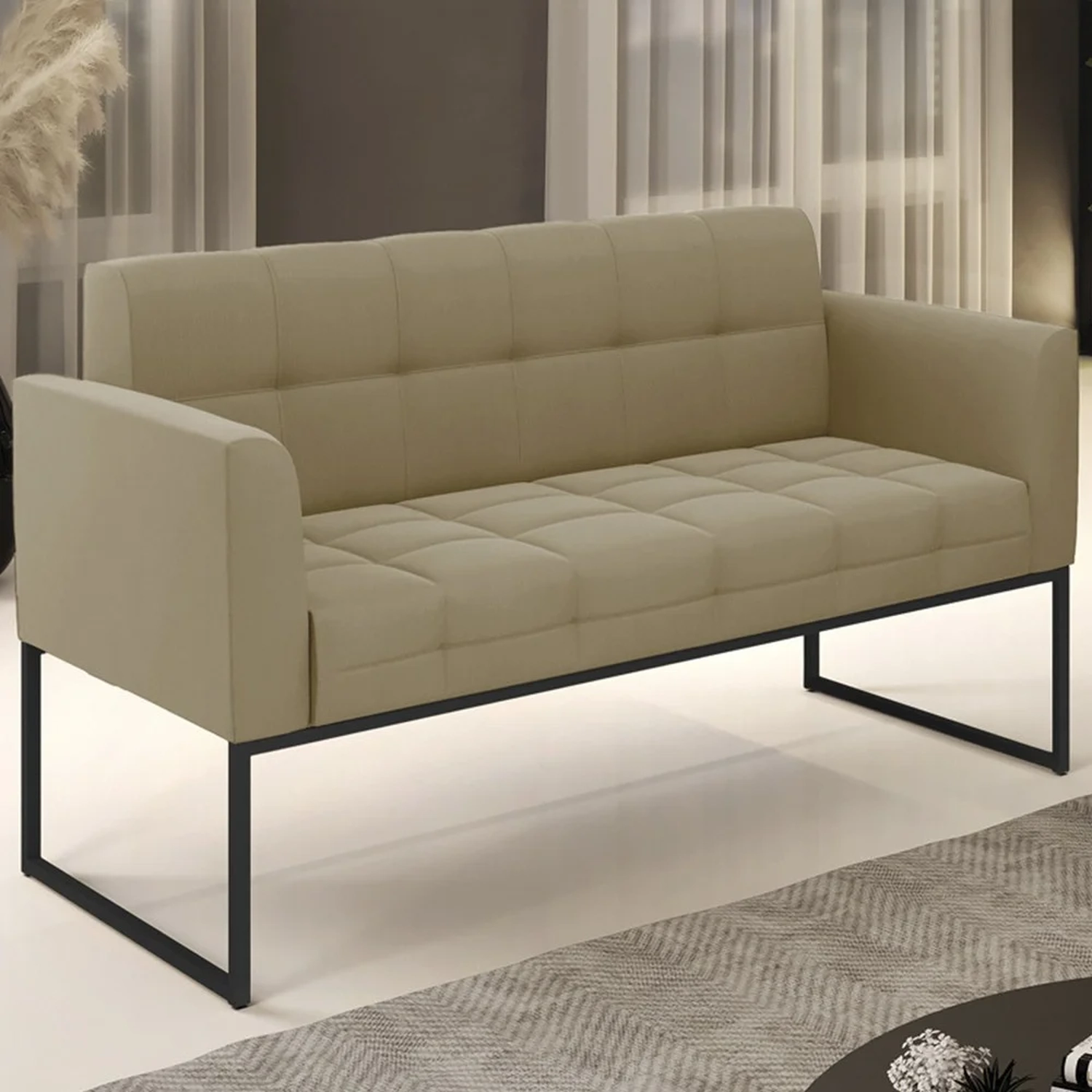 Esta Namoradeira é revestida em Suede, que é durável e fácil de limpar, e ainda valoriza o design do sofá. Os braços e encosto são confortáveis em espuma D-18, já o assento é com espuma D-26 de alta densidade, que garante um assento firme e aconchegante, ideal para relaxar após um dia cansativo. A base industrial é um charme à parte, que confere um toque Moderno e sofisticado à peça. O Sofá Namoradeira tem uma estrutura resistente e suporta até 120 kg. A montagem é muito simples, pois ela já vem pronta, bastando apenas fixar a base com os parafusos que acompanham o produto. A limpeza também é muito prática, pois basta utilizar um pano limpo e levemente úmido, sem produtos abrasivos, para manter a sua Namoradeira sempre em bom estado. Sem dúvidas essa Namoradeira 2 Lugares, vai transformar a sua sala em um ambiente mais confortável e estiloso!