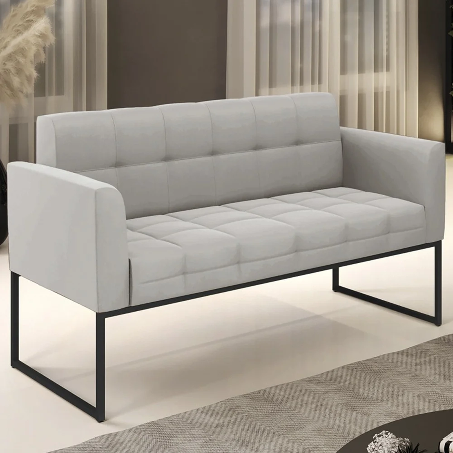 Querida por muitos pela beleza e conforto que proporciona, sua versatilidade dá a liberdade de poder usar na sua Sala De Estar, recepção e onde mais desejar! Você vai adorar o Sofá Namoradeira Base Industrial Preto Ana Veludo Cinza, da Ibiza!