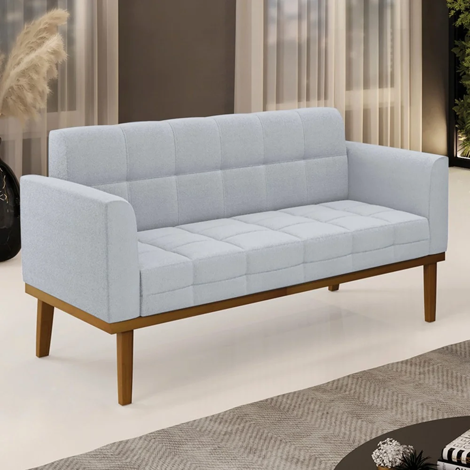 Querida por muitos pela beleza e conforto que proporciona, sua versatilidade dá a liberdade de poder usar na sua Sala De Estar, recepção e onde mais desejar! Você vai adorar o Sofá Namoradeira Base Madeira Castanho Ana Boucle Cinza, da Ibiza!