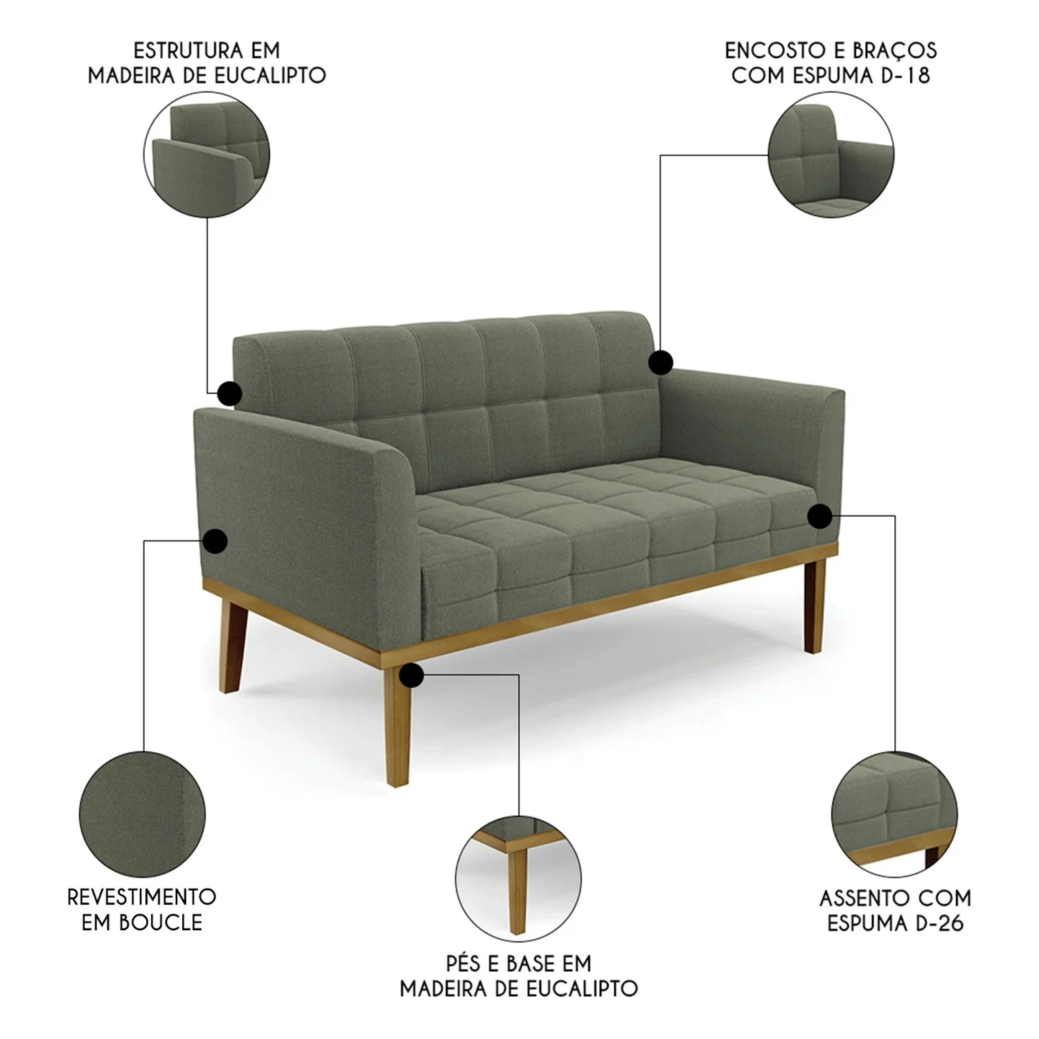 Esta Namoradeira é revestida em Boucle, que é confortável, suave ao toque, e ainda valoriza o design do sofá. Os braços e encosto são confortáveis em espuma D-18, já o assento é com espuma D-26 de alta densidade, que garante um assento firme e aconchegante, ideal para relaxar após um dia cansativo. A base em madeira de eucalipto é um charme à parte, que confere um toque Rústico e sofisticado à peça. O Sofá Namoradeira tem uma estrutura resistente e suporta até 120 kg. A montagem é muito simples, pois ela já vem pronta, bastando apenas fixar a base com os parafusos que acompanham o produto. A limpeza também é muito prática, pois basta utilizar um pano limpo e levemente úmido, sem produtos abrasivos, para manter a sua Namoradeira sempre em bom estado. Sem dúvidas essa Namoradeira 2 Lugares, vai transformar a sua sala em um ambiente mais confortável e estiloso!