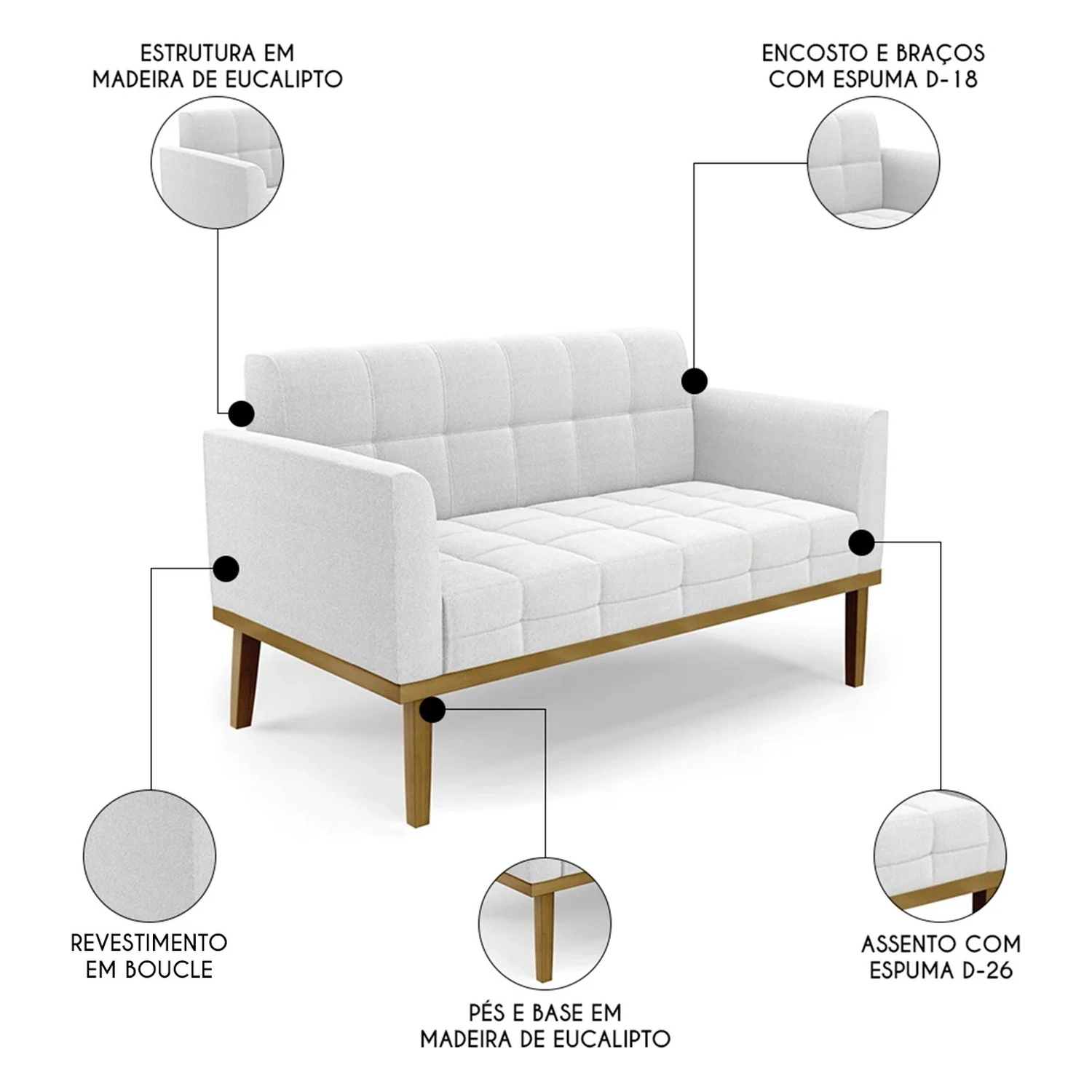 Esta Namoradeira é revestida em Boucle, que é confortável, suave ao toque, e ainda valoriza o design do sofá. Os braços e encosto são confortáveis em espuma D-18, já o assento é com espuma D-26 de alta densidade, que garante um assento firme e aconchegante, ideal para relaxar após um dia cansativo. A base em madeira de eucalipto é um charme à parte, que confere um toque Rústico e sofisticado à peça. O Sofá Namoradeira tem uma estrutura resistente e suporta até 120 kg. A montagem é muito simples, pois ela já vem pronta, bastando apenas fixar a base com os parafusos que acompanham o produto. A limpeza também é muito prática, pois basta utilizar um pano limpo e levemente úmido, sem produtos abrasivos, para manter a sua Namoradeira sempre em bom estado. Sem dúvidas essa Namoradeira 2 Lugares, vai transformar a sua sala em um ambiente mais confortável e estiloso!
