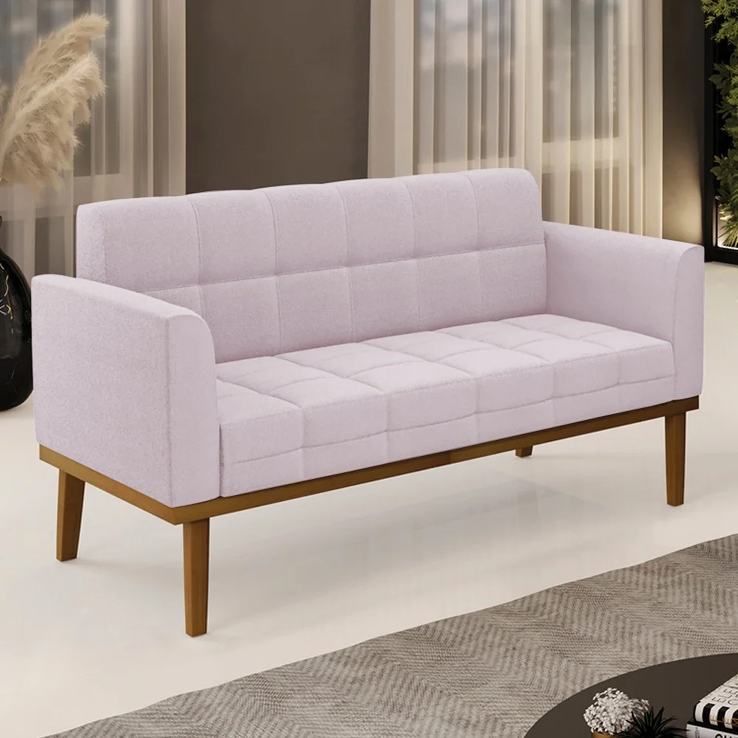 Querida por muitos pela beleza e conforto que proporciona, sua versatilidade dá a liberdade de poder usar na sua Sala De Estar, recepção e onde mais desejar! Você vai adorar o Sofá Namoradeira Base Madeira Castanho Ana Boucle Rosê, da Ibiza!