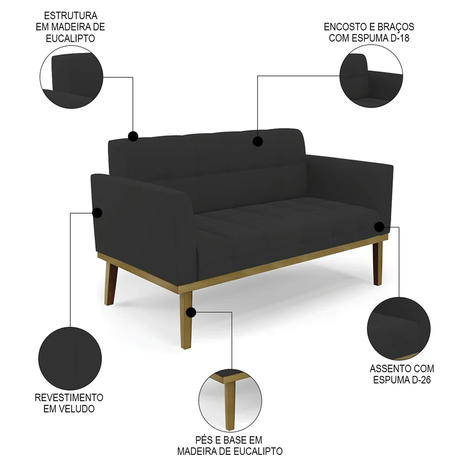 Esta Namoradeira é revestida em Veludo, que é durável e fácil de limpar, e ainda valoriza o design do sofá. Os braços e encosto são confortáveis em espuma D-18, já o assento é com espuma D-26 de alta densidade, que garante um assento firme e aconchegante, ideal para relaxar após um dia cansativo. A base em madeira de eucalipto é um charme à parte, que confere um toque Rústico e sofisticado à peça. O Sofá Namoradeira tem uma estrutura resistente e suporta até 120 kg. A montagem é muito simples, pois ela já vem pronta, bastando apenas fixar a base com os parafusos que acompanham o produto. A limpeza também é muito prática, pois basta utilizar um pano limpo e levemente úmido, sem produtos abrasivos, para manter a sua Namoradeira sempre em bom estado. Sem dúvidas essa Namoradeira 2 Lugares, vai transformar a sua sala em um ambiente mais confortável e estiloso!