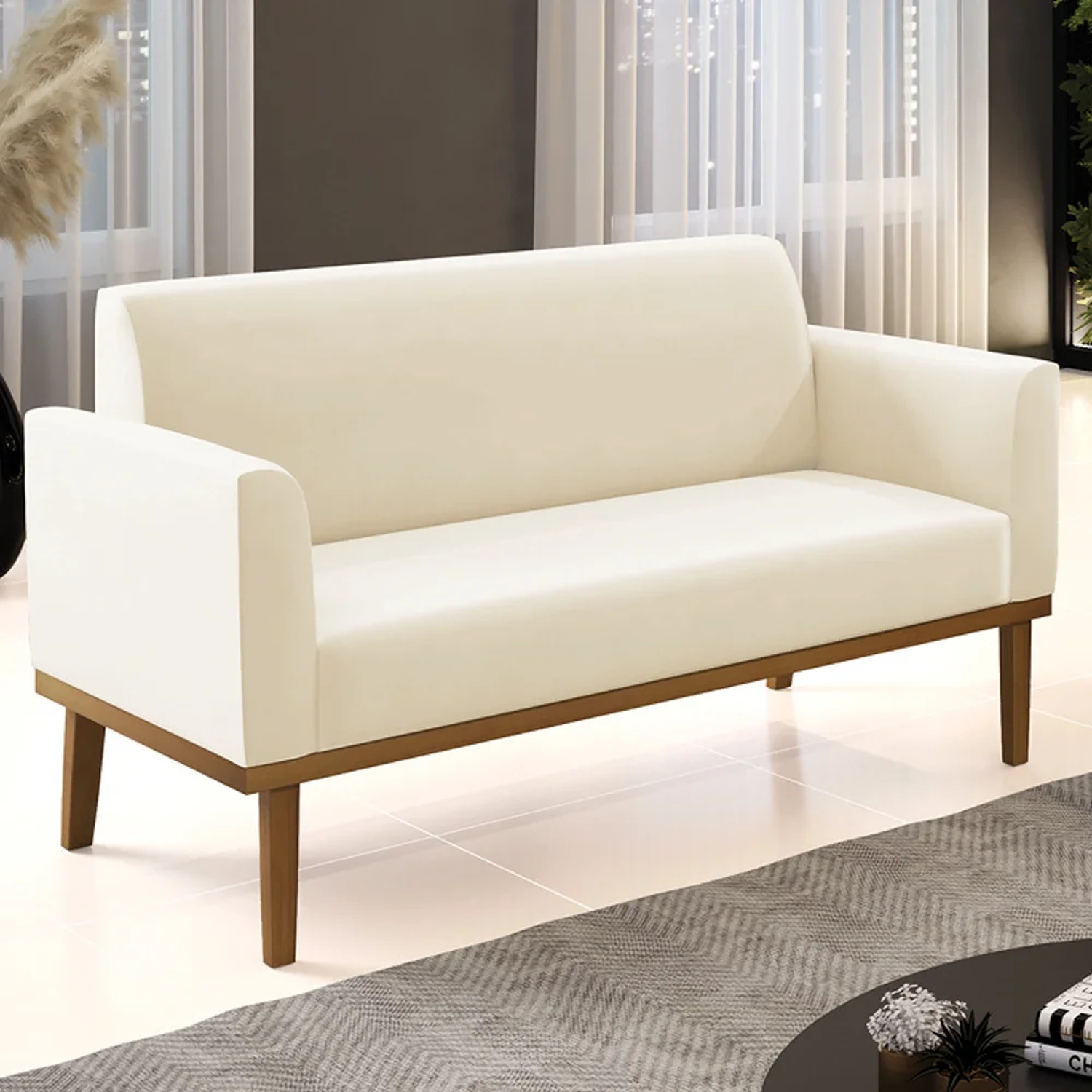 Esta Namoradeira é revestida em Veludo, que é durável e fácil de limpar, e ainda valoriza o design do sofá. Os braços e encosto são confortáveis em espuma D-18, já o assento é com espuma D-26 de alta densidade, que garante um assento firme e aconchegante, ideal para relaxar após um dia cansativo. A base em madeira de eucalipto é um charme à parte, que confere um toque Rústico e sofisticado à peça. O Sofá Namoradeira tem uma estrutura resistente e suporta até 120 kg. A montagem é muito simples, pois ela já vem pronta, bastando apenas fixar a base com os parafusos que acompanham o produto. A limpeza também é muito prática, pois basta utilizar um pano limpo e levemente úmido, sem produtos abrasivos, para manter a sua Namoradeira sempre em bom estado. Sem dúvidas essa Namoradeira 2 Lugares, vai transformar a sua sala em um ambiente mais confortável e estiloso!