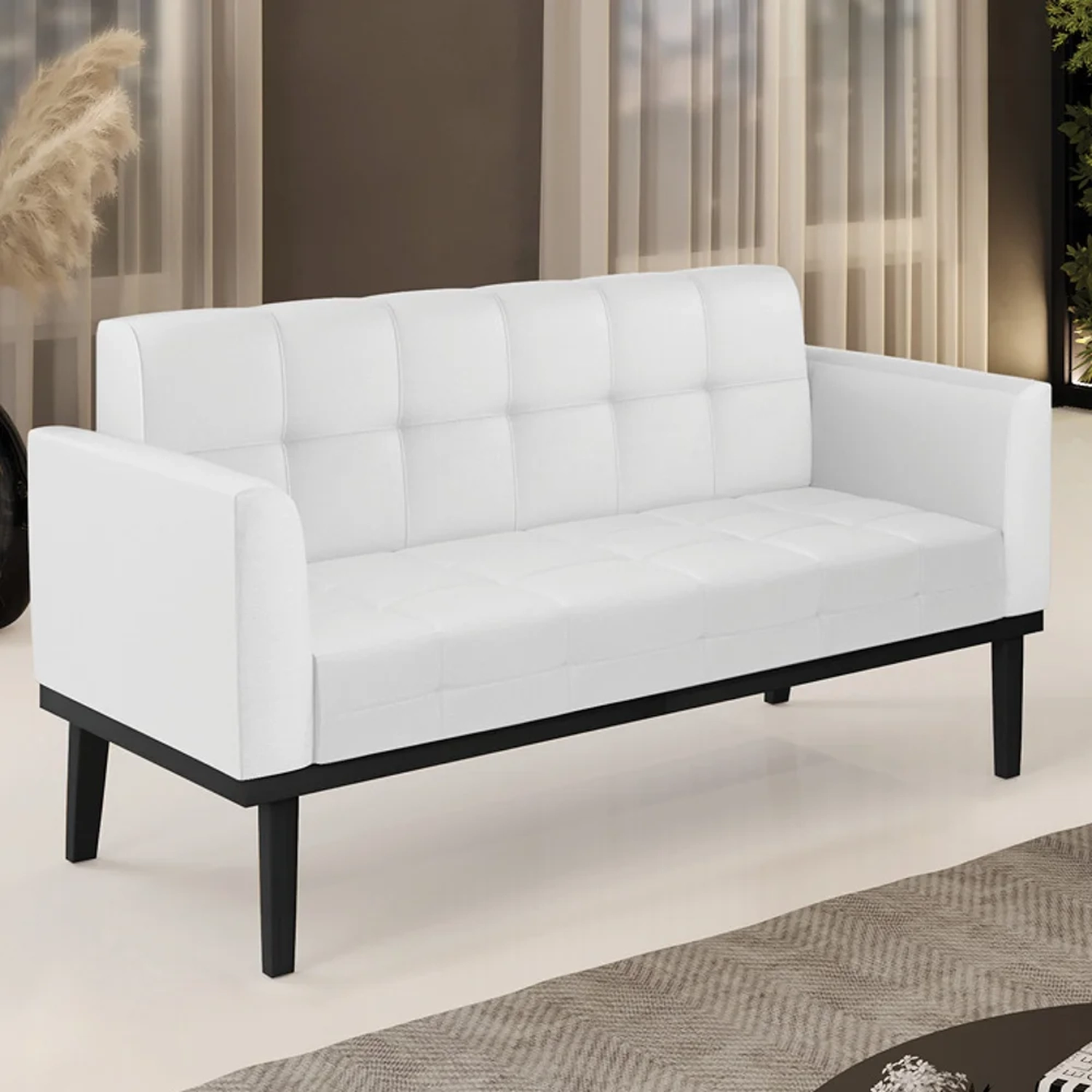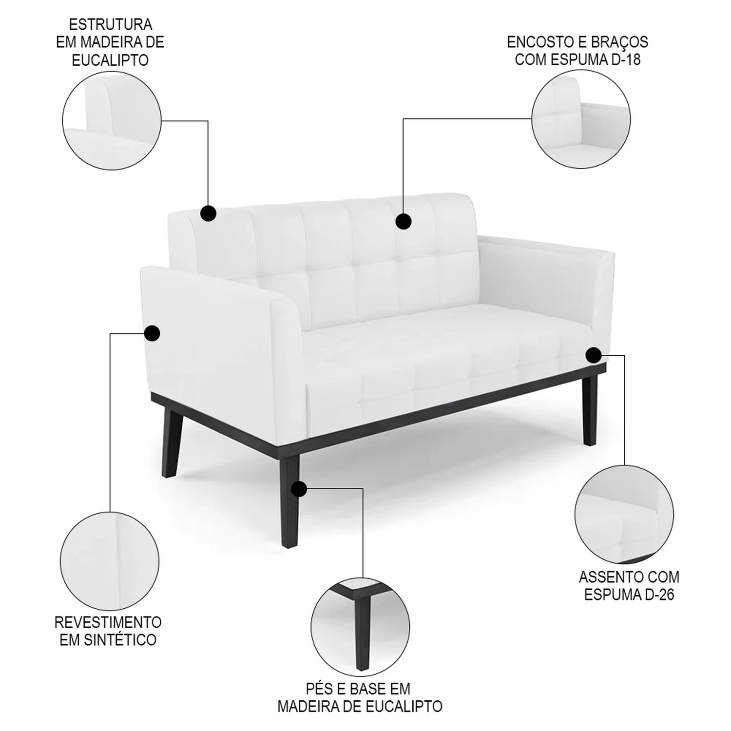 Querida por muitos pela beleza e conforto que proporciona, sua versatilidade dá a liberdade de poder usar na sua Sala De Estar, recepção e onde mais desejar! Você vai adorar o Sofá Namoradeira Base Madeira Preto Ana Sintético Branco, da Ibiza!