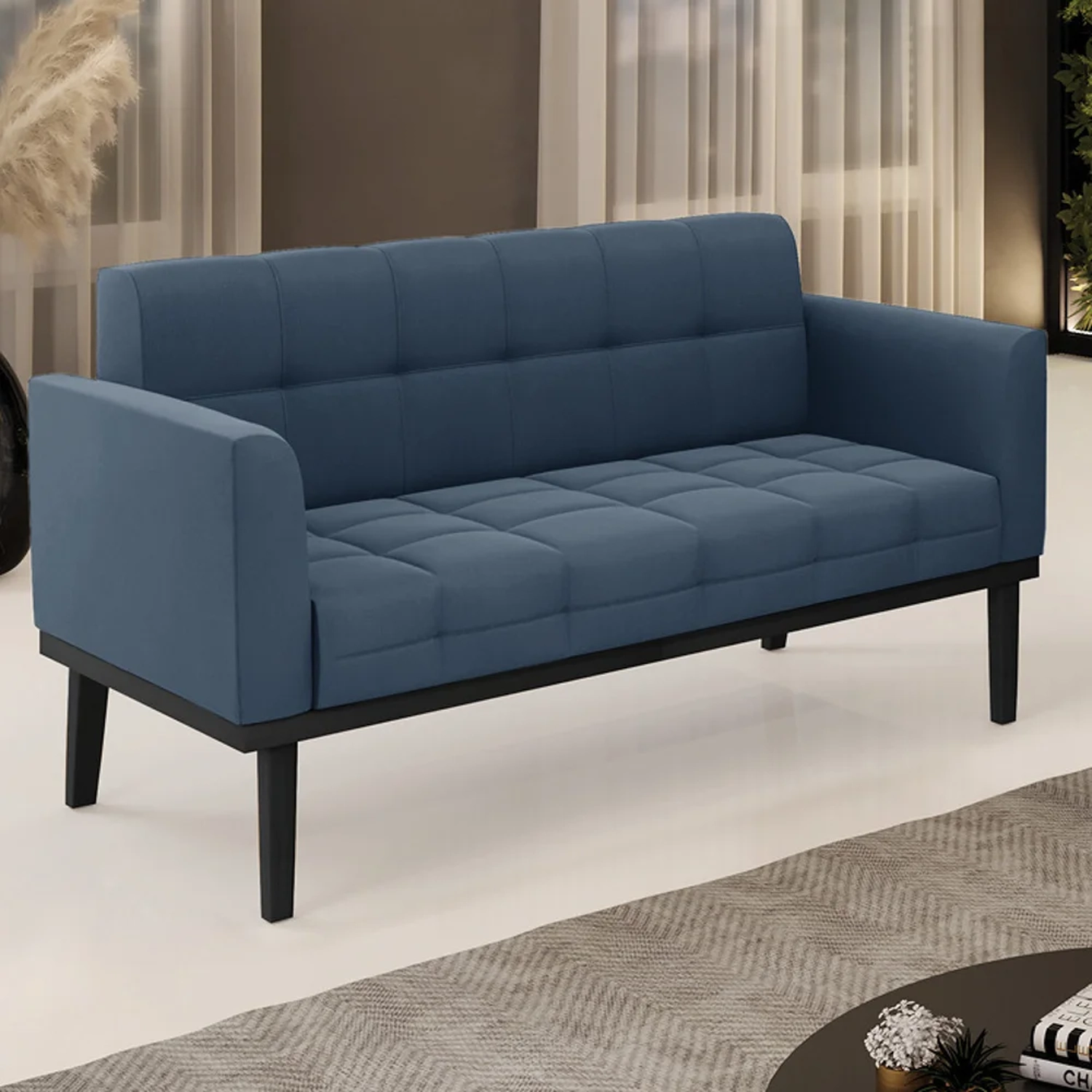 Querida por muitos pela beleza e conforto que proporciona, sua versatilidade dá a liberdade de poder usar na sua Sala De Estar, recepção e onde mais desejar! Você vai adorar o Sofá Namoradeira Base Madeira Preto Ana Suede Azul Marinho, da Ibiza!