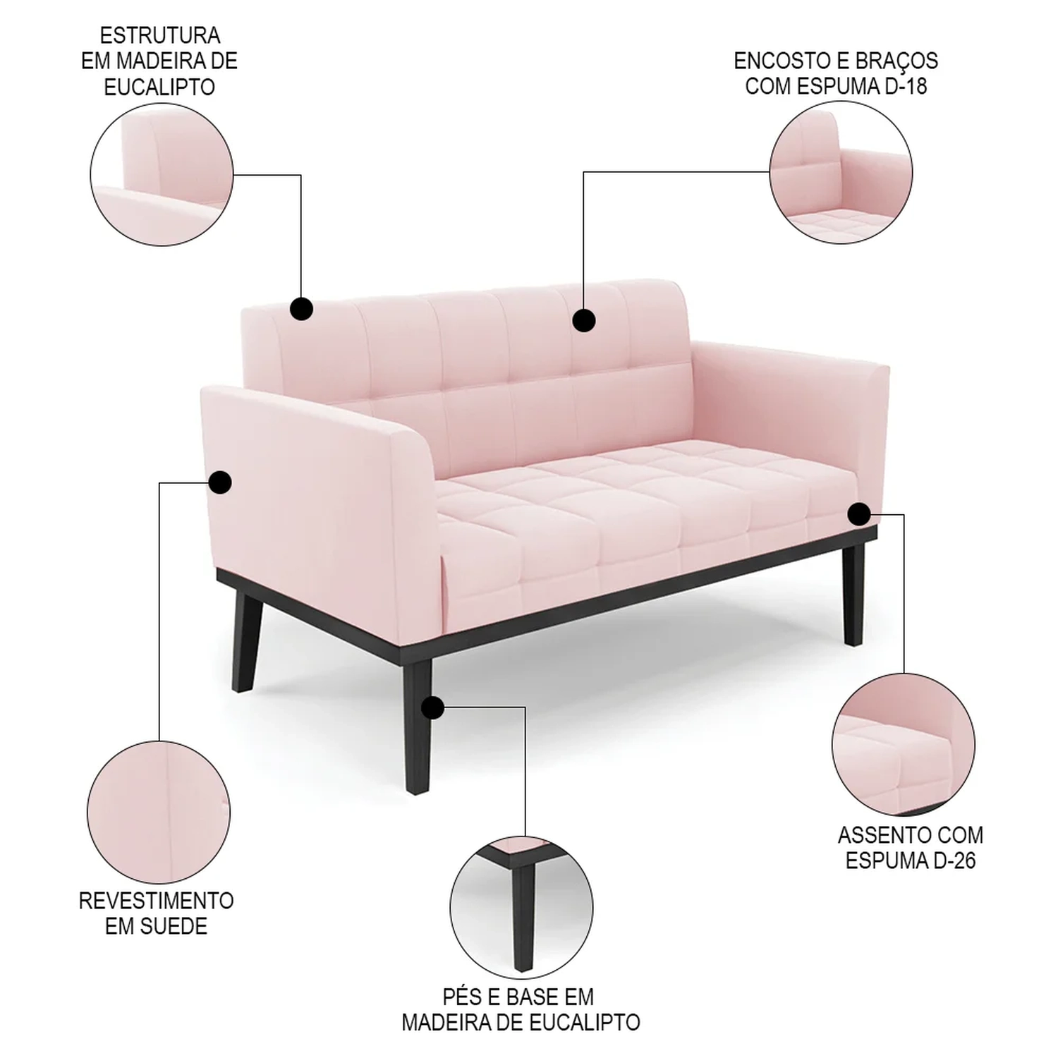 Querida por muitos pela beleza e conforto que proporciona, sua versatilidade dá a liberdade de poder usar na sua Sala De Estar, recepção e onde mais desejar! Você vai adorar o Sofá Namoradeira Base Madeira Preto Ana Suede Rosa Bebê, da Ibiza!