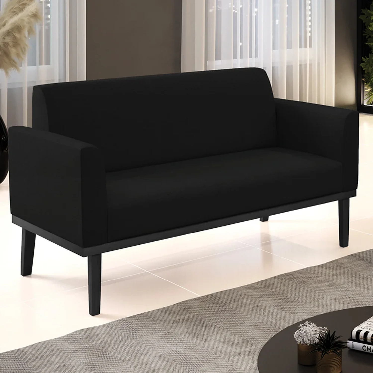 Querida por muitos pela beleza e conforto que proporciona, sua versatilidade dá a liberdade de poder usar na sua Sala De Estar, recepção e onde mais desejar! Você vai adorar o Sofá Namoradeira Base Madeira Preto Maressa Linho Preto, da Ibiza!