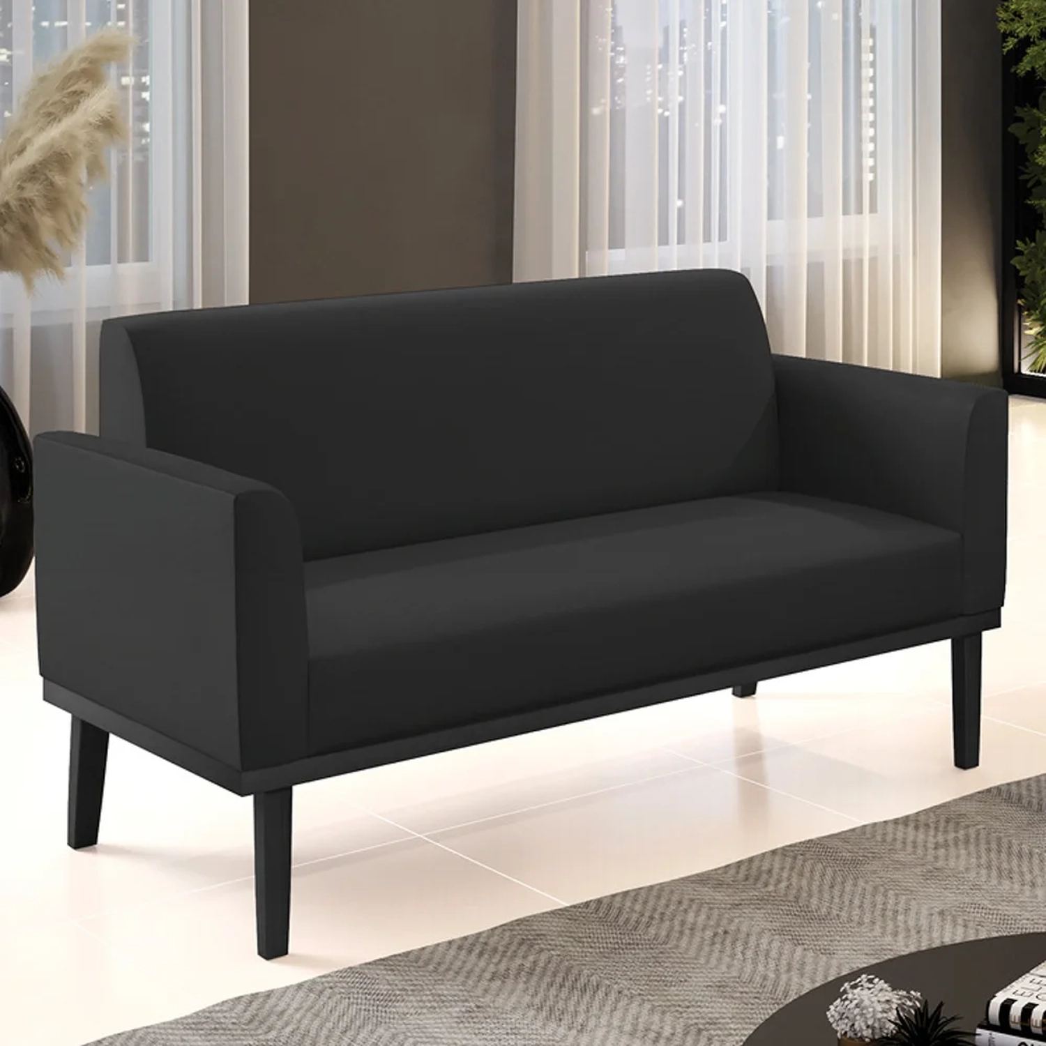 Querida por muitos pela beleza e conforto que proporciona, sua versatilidade dá a liberdade de poder usar na sua Sala De Estar, recepção e onde mais desejar! Você vai adorar o Sofá Namoradeira Base Madeira Preto Maressa Sintético Preto, da Ibiza!