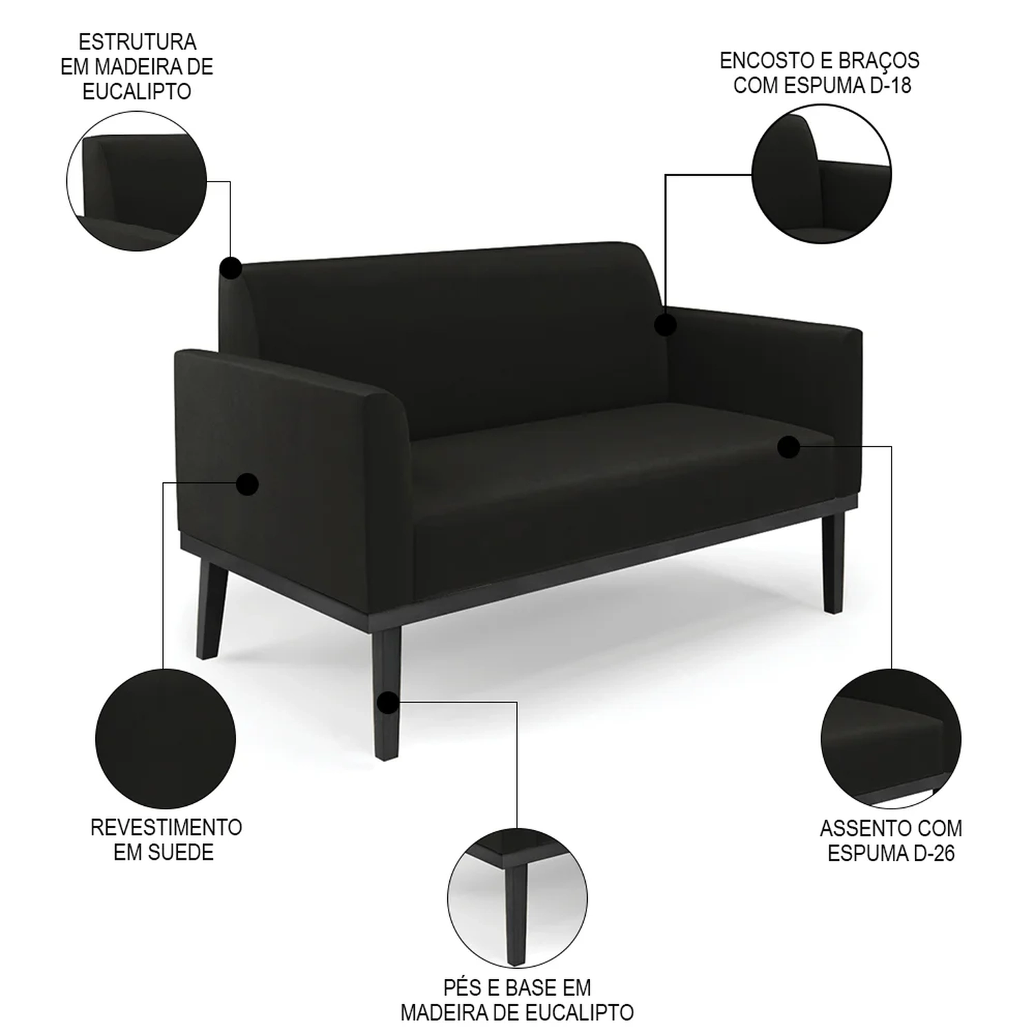 Material da Espuma: Assento D-26/ Encosto e braços D-18.