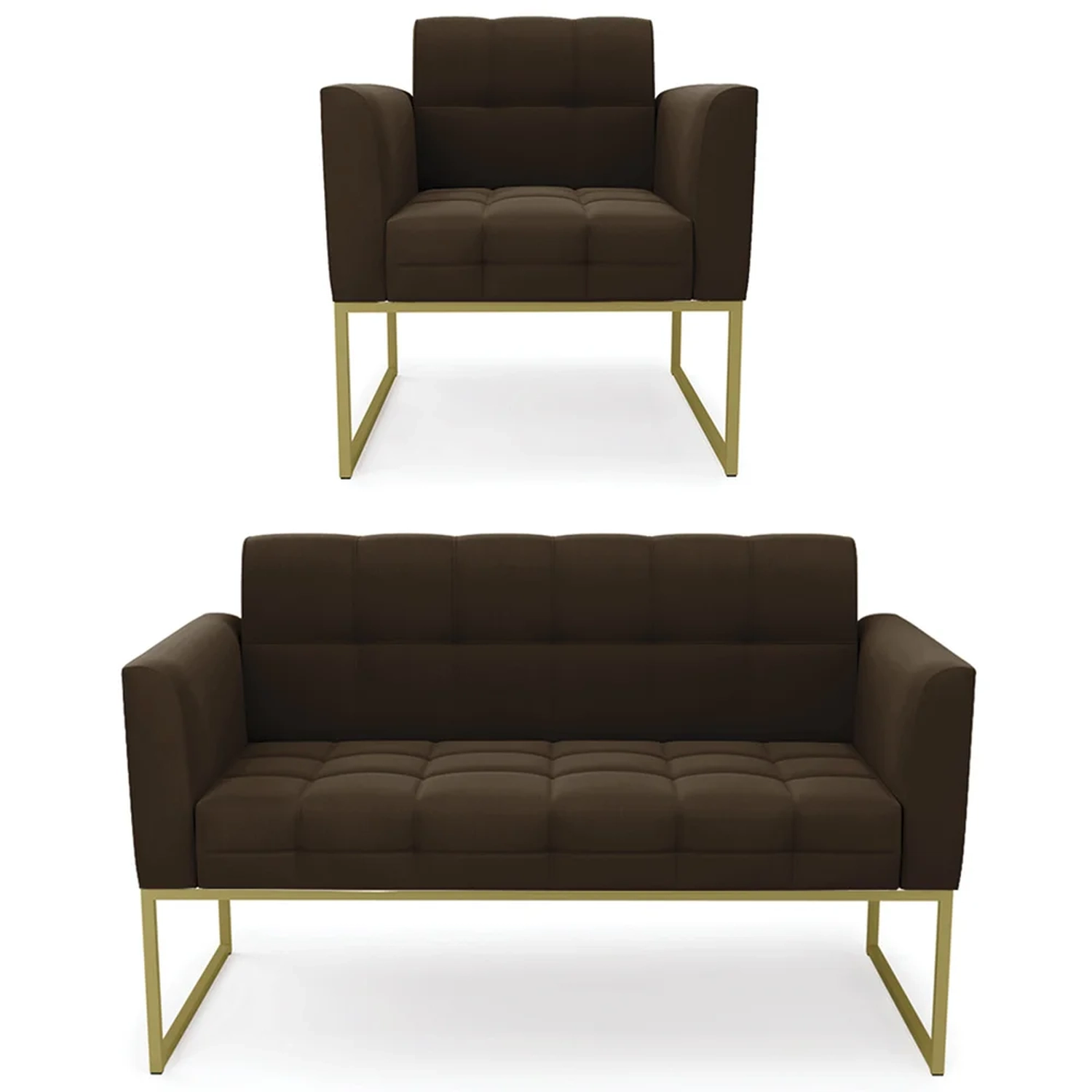 O Sofá Namoradeira e 1 Poltrona Base Industrial Dourado Ana Suede Marrom, da Ibiza é o conjunto ideal para quem busca beleza, conforto e versatilidade. Você pode usar na sua Sala De Estar, recepção ou qualquer outro ambiente que desejar.
