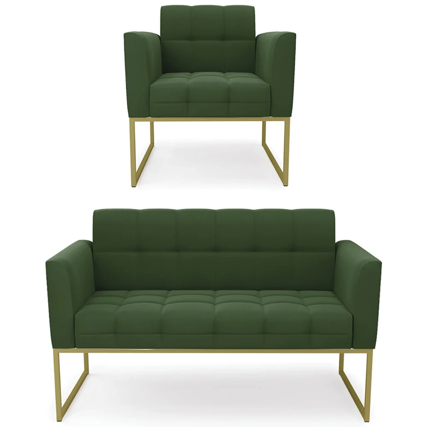O Sofá Namoradeira e 1 Poltrona Base Industrial Dourado Ana Suede Verde, da Ibiza é o conjunto ideal para quem busca beleza, conforto e versatilidade. Você pode usar na sua Sala De Estar, recepção ou qualquer outro ambiente que desejar.