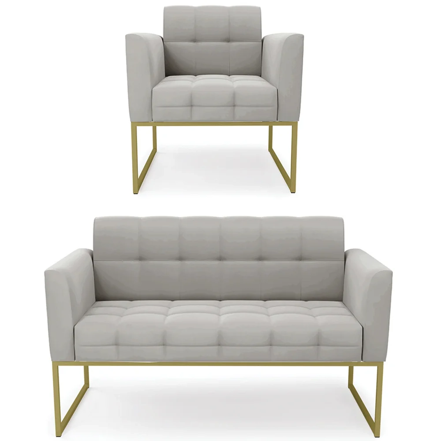O Sofá Namoradeira e 1 Poltrona Base Industrial Dourado Ana Veludo Cinza, da Ibiza é o conjunto ideal para quem busca beleza, conforto e versatilidade. Você pode usar na sua Sala De Estar, recepção ou qualquer outro ambiente que desejar.