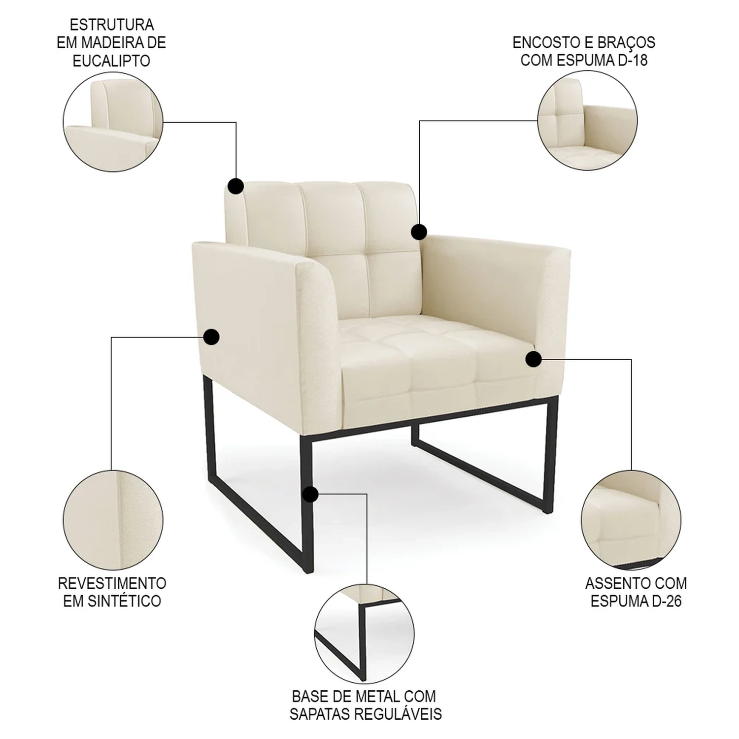 Material da Espuma: Assento D-26/ Encosto e braços D-18.