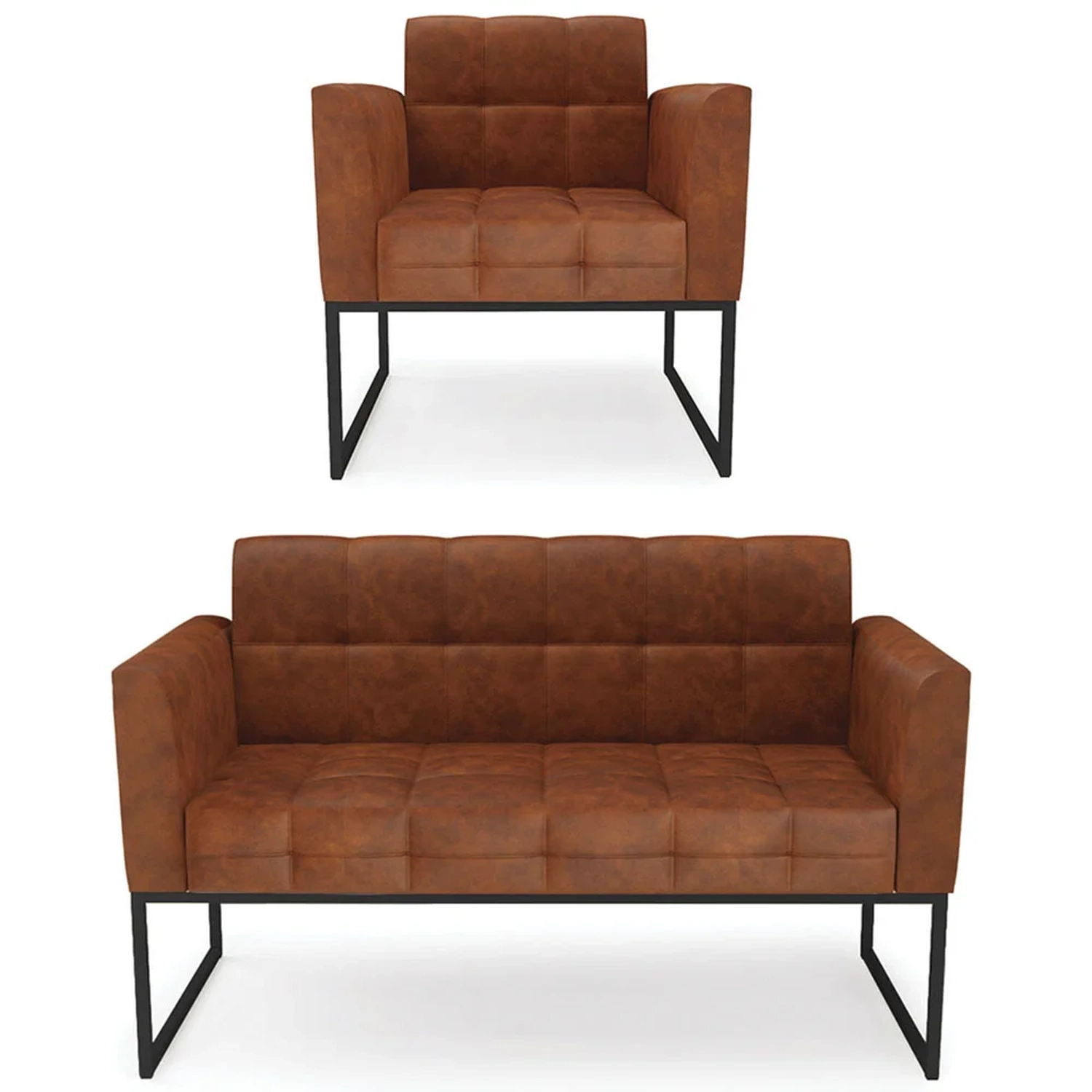 O Sofá Namoradeira e a Poltrona Decorativa são revestidos em sintético, que é fácil de limpar e valoriza o design das peças. Eles têm braços e encosto em espuma D-18 e assento em espuma D-26, que oferecem firmeza e aconchego para você relaxar. A base industrial é um detalhe charmoso, que dá um toque moderno e sofisticado ao conjunto. O kit tem uma estrutura resistente e suporta até 120 kg cada peça. A montagem é simples, pois as peças já vêm prontas, bastando fixar a base com os parafusos que acompanham o produto. A limpeza é prática, pois basta usar um pano limpo e levemente úmido, sem produtos abrasivos, para manter o seu kit sempre em bom estado. Hora de transformar seu ambiente com a Namoradeira 2 Lugares e a Poltrona para Sala deixando ainda mais confortável e estiloso.