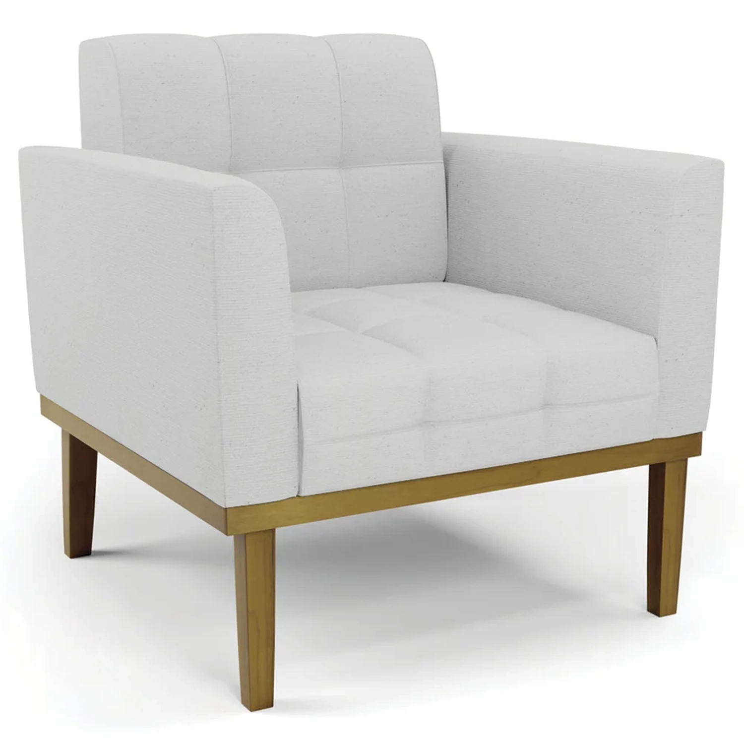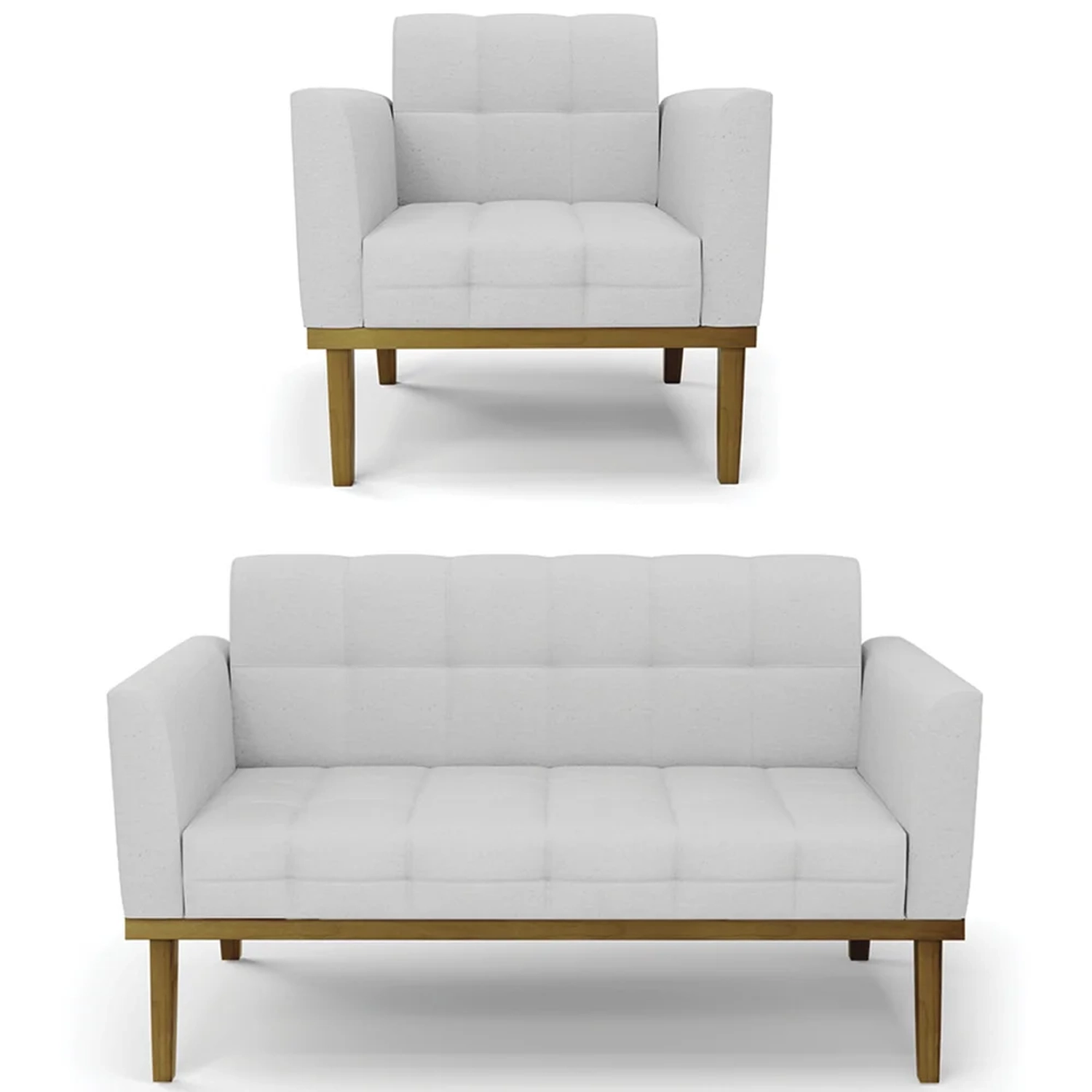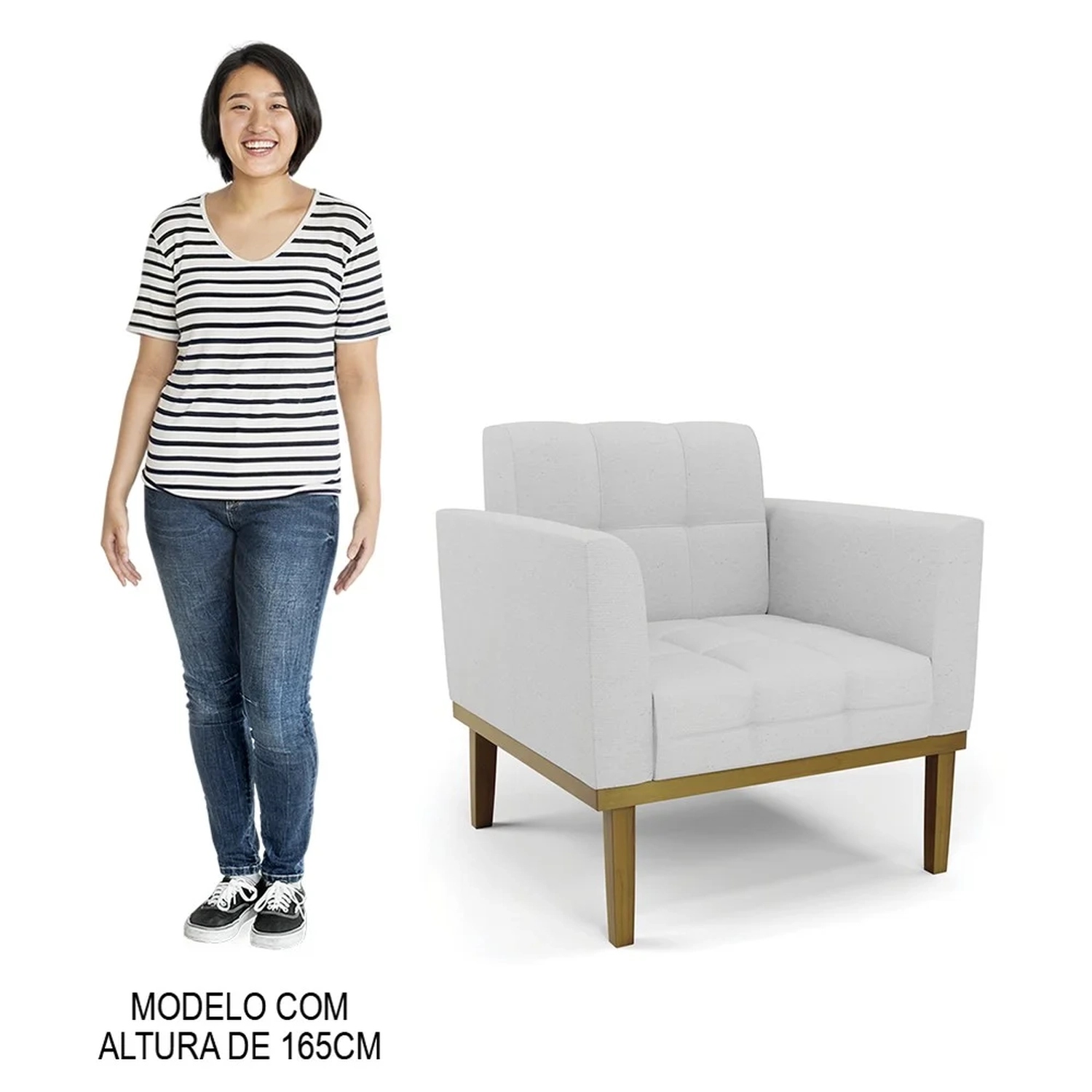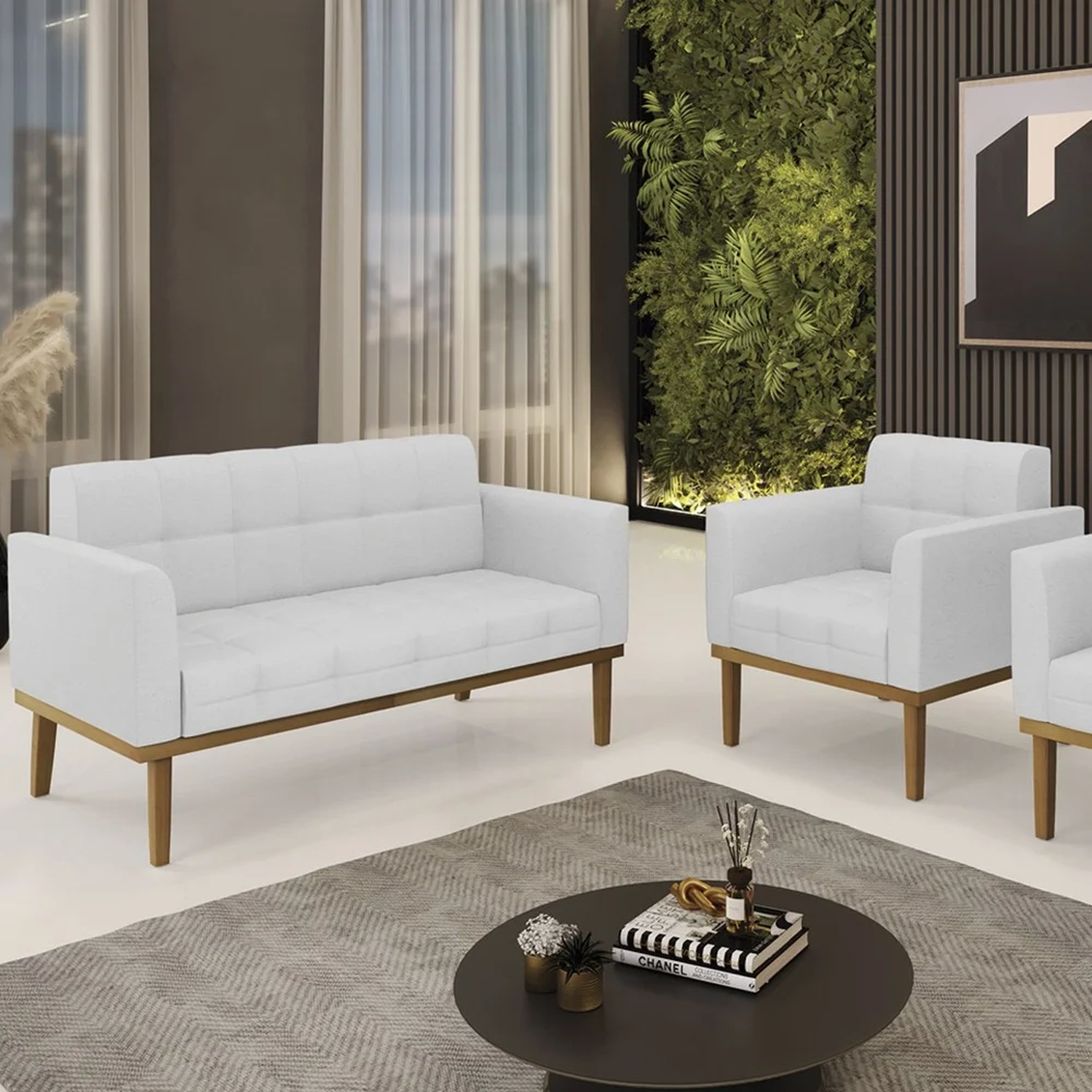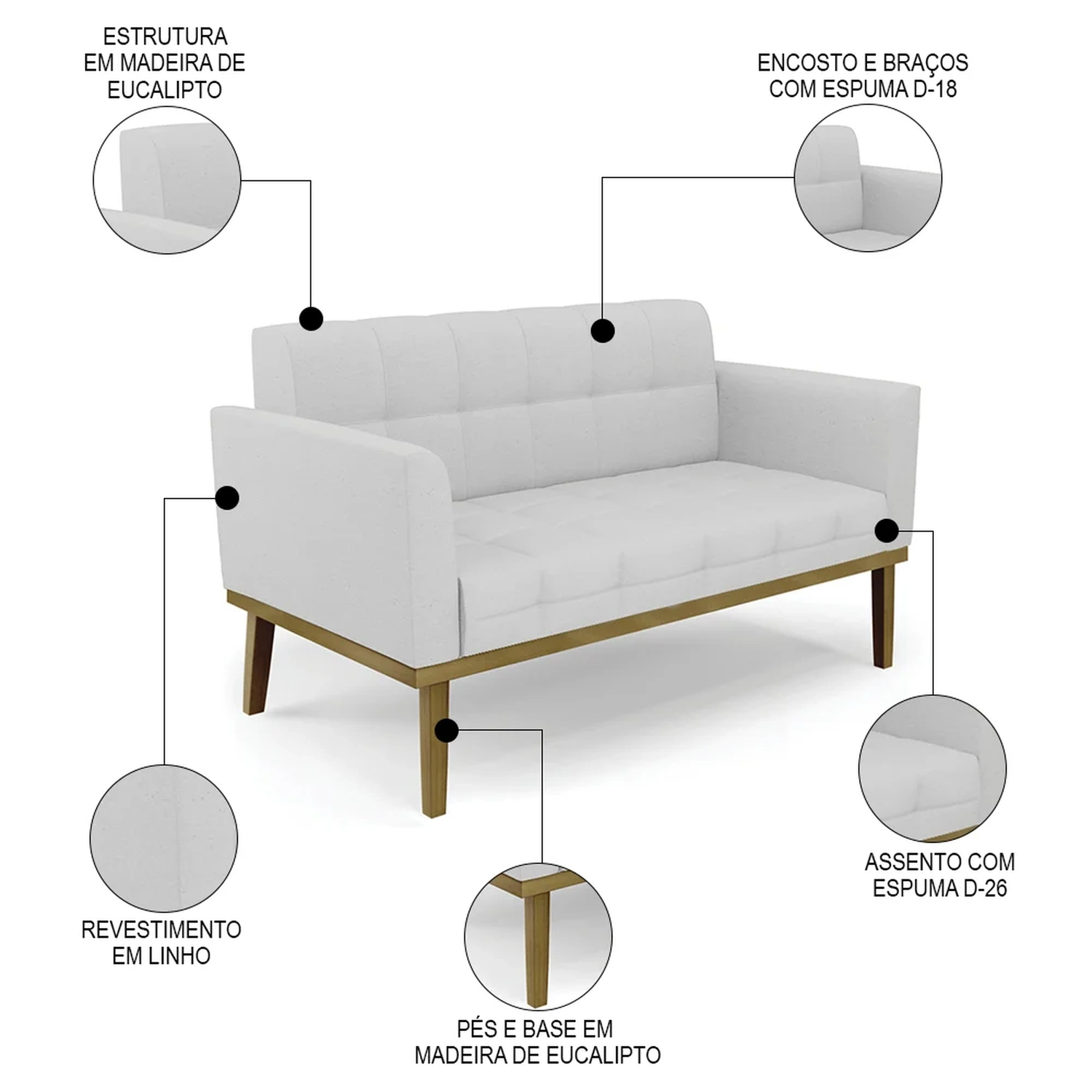 O Sofá Namoradeira e a Poltrona Decorativa são revestidos em Linho, que é fácil de limpar e valoriza o design das peças. Eles têm braços e encosto em espuma D-18 e assento em espuma D-26, que oferecem firmeza e aconchego para você relaxar. A base em madeira de eucalipto castanho é um detalhe charmoso, que dá um toque rústico e sofisticado ao conjunto. O kit tem uma estrutura resistente e suporta até 120 kg cada peça. A montagem é simples, pois as peças já vêm prontas, bastando fixar a base com os parafusos que acompanham o produto. A limpeza é prática, pois basta usar um pano limpo e levemente úmido, sem produtos abrasivos, para manter o seu kit sempre em bom estado. Hora de transformar seu ambiente com a Namoradeira 2 Lugares e a Poltrona para Sala deixando ainda mais confortável e estiloso.