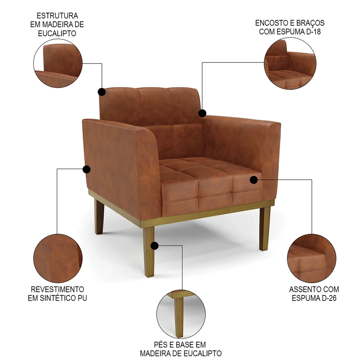 Material da Espuma: Assento D-26/ Encosto e braços D-18.
