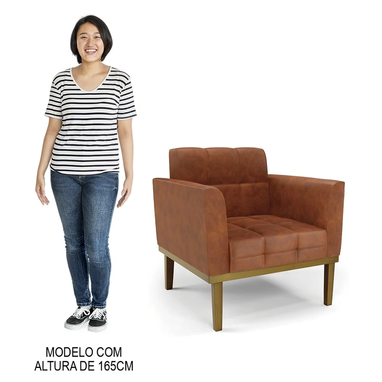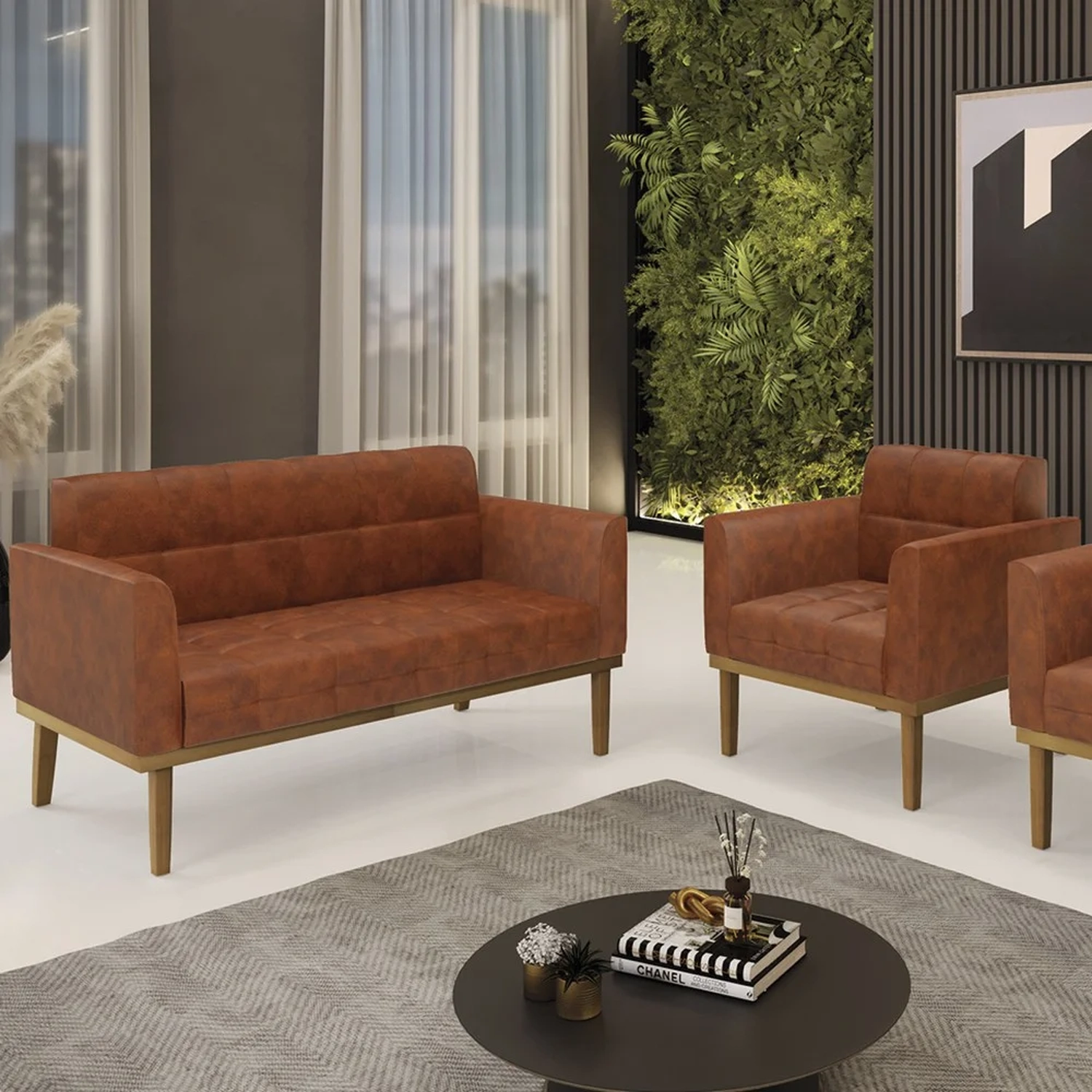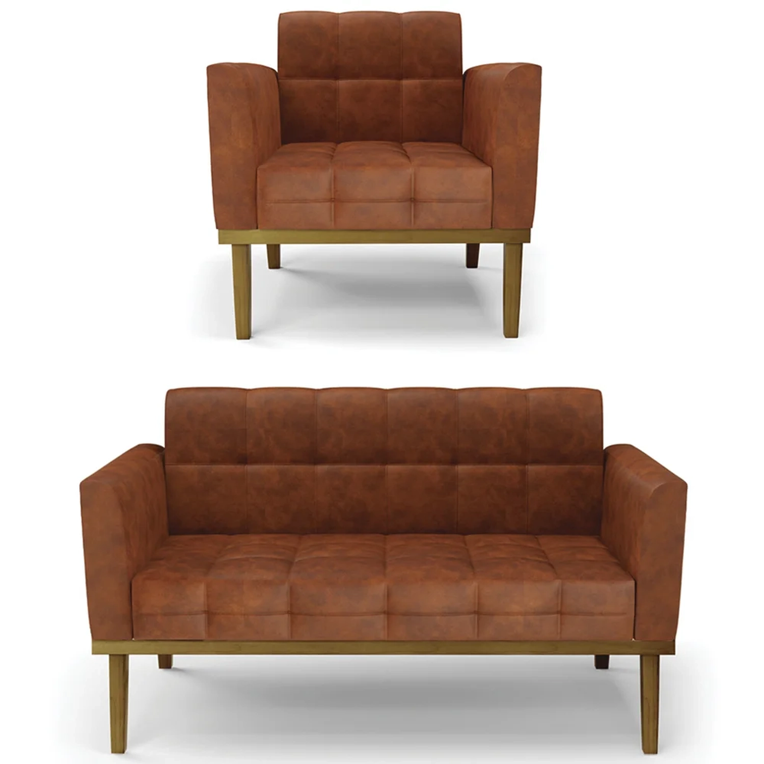 O Sofá Namoradeira e a Poltrona Decorativa são revestidos em sintético, que é fácil de limpar e valoriza o design das peças. Eles têm braços e encosto em espuma D-18 e assento em espuma D-26, que oferecem firmeza e aconchego para você relaxar. A base em madeira de eucalipto castanho é um detalhe charmoso, que dá um toque rústico e sofisticado ao conjunto. O kit tem uma estrutura resistente e suporta até 120 kg cada peça. A montagem é simples, pois as peças já vêm prontas, bastando fixar a base com os parafusos que acompanham o produto. A limpeza é prática, pois basta usar um pano limpo e levemente úmido, sem produtos abrasivos, para manter o seu kit sempre em bom estado. Hora de transformar seu ambiente com a Namoradeira 2 Lugares e a Poltrona para Sala deixando ainda mais confortável e estiloso.