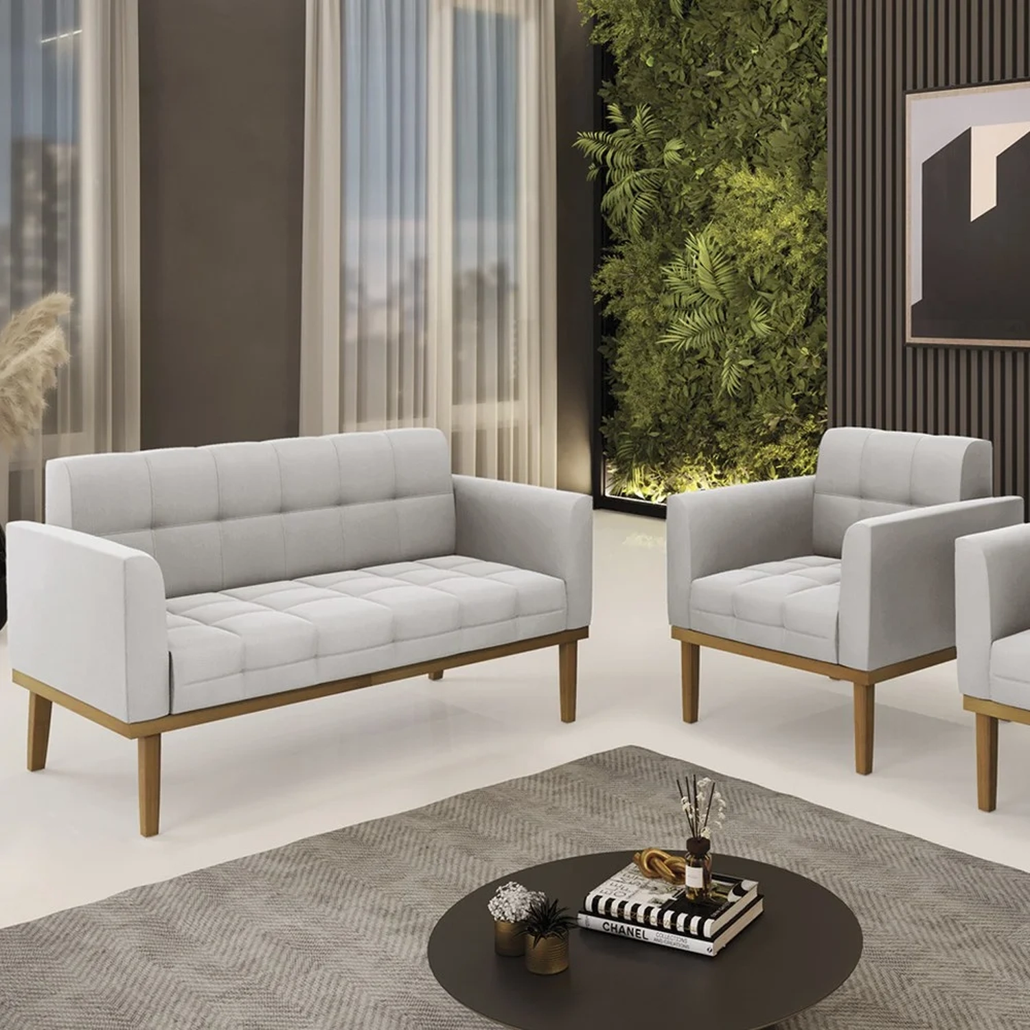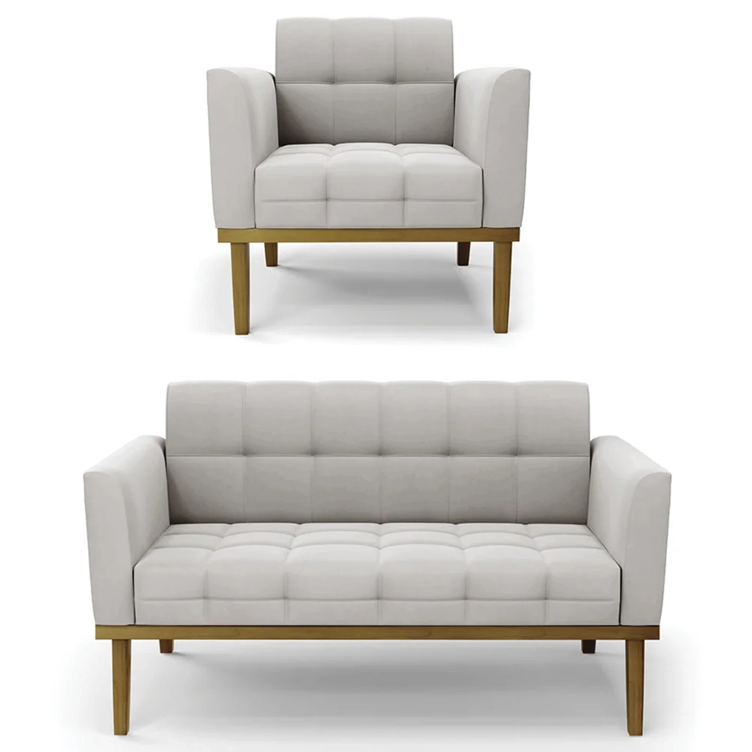 O Sofá Namoradeira e a Poltrona Decorativa são revestidos em Veludo, que é fácil de limpar e valoriza o design das peças. Eles têm braços e encosto em espuma D-18 e assento em espuma D-26, que oferecem firmeza e aconchego para você relaxar. A base em madeira de eucalipto castanho é um detalhe charmoso, que dá um toque rústico e sofisticado ao conjunto. O kit tem uma estrutura resistente e suporta até 120 kg cada peça. A montagem é simples, pois as peças já vêm prontas, bastando fixar a base com os parafusos que acompanham o produto. A limpeza é prática, pois basta usar um pano limpo e levemente úmido, sem produtos abrasivos, para manter o seu kit sempre em bom estado. Hora de transformar seu ambiente com a Namoradeira 2 Lugares e a Poltrona para Sala deixando ainda mais confortável e estiloso.