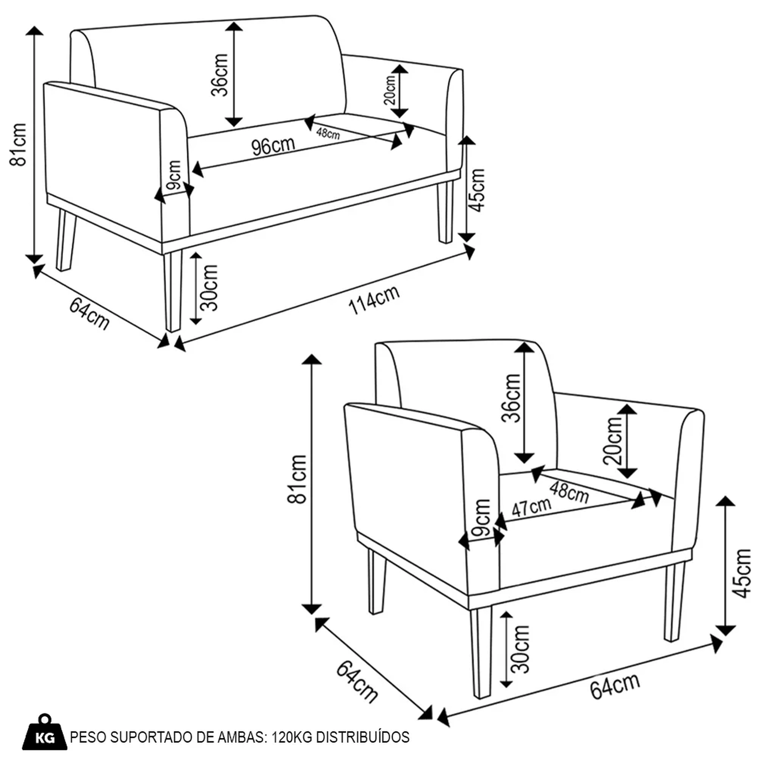 O Sofá Namoradeira e a Poltrona Decorativa são revestidos em sintético PU branco, que é fácil de limpar e valoriza o design das peças. Eles têm braços e encosto em espuma D-18 e assento em espuma D-26, que oferecem firmeza e aconchego para você relaxar. A base em madeira de eucalipto castanho é um detalhe charmoso, que dá um toque rústico e sofisticado ao conjunto. O kit tem uma estrutura resistente e suporta até 120 kg cada peça. A montagem é simples, pois as peças já vêm prontas, bastando fixar a base com os parafusos que acompanham o produto. A limpeza é prática, pois basta usar um pano limpo e levemente úmido, sem produtos abrasivos, para manter o seu kit sempre em bom estado. Hora de transformar seu ambiente com a Namoradeira 2 Lugares e a Poltrona para Sala deixando ainda mais confortável e estiloso.