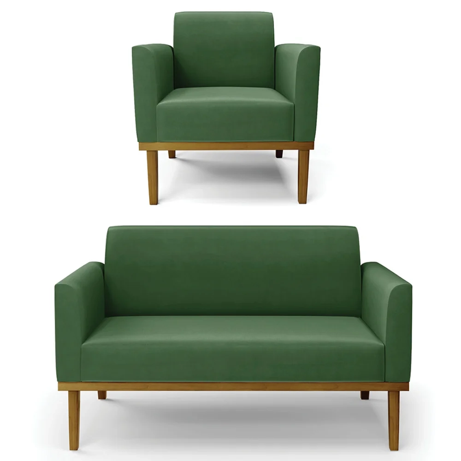 O Sofá Namoradeira e 1 Poltrona Base Madeira Castanho Maressa Suede Verde, da Ibiza é o conjunto ideal para quem busca beleza, conforto e versatilidade. Você pode usar na sua Sala De Estar, recepção ou qualquer outro ambiente que desejar.