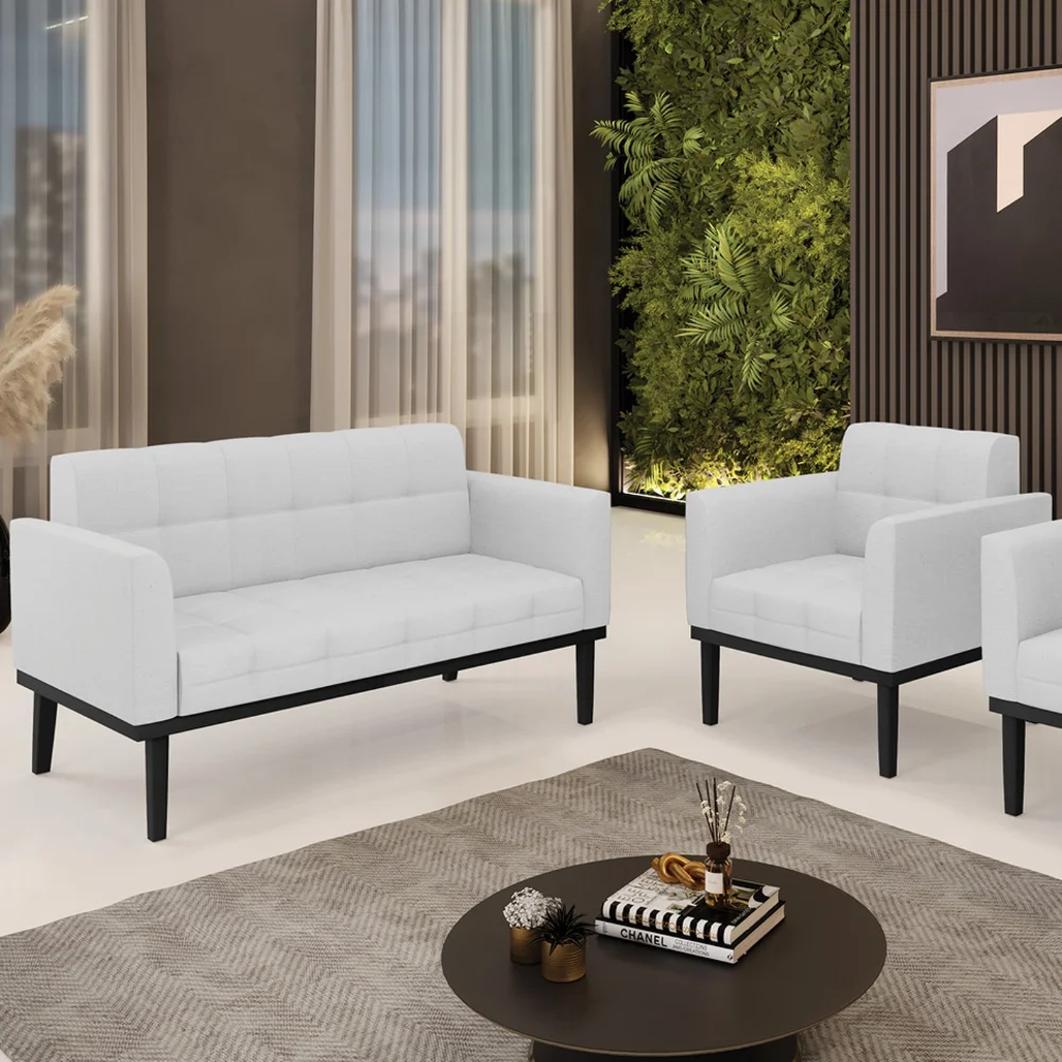 O Sofá Namoradeira e a Poltrona Decorativa são revestidos em Linho, que é fácil de limpar e valoriza o design das peças. Eles têm braços e encosto em espuma D-18 e assento em espuma D-26, que oferecem firmeza e aconchego para você relaxar. A base em madeira de eucalipto Preto é um detalhe charmoso, que dá um toque rústico e sofisticado ao conjunto. O kit tem uma estrutura resistente e suporta até 120 kg cada peça. A montagem é simples, pois as peças já vêm prontas, bastando fixar a base com os parafusos que acompanham o produto. A limpeza é prática, pois basta usar um pano limpo e levemente úmido, sem produtos abrasivos, para manter o seu kit sempre em bom estado. Hora de transformar seu ambiente com a Namoradeira 2 Lugares e a Poltrona para Sala deixando ainda mais confortável e estiloso.