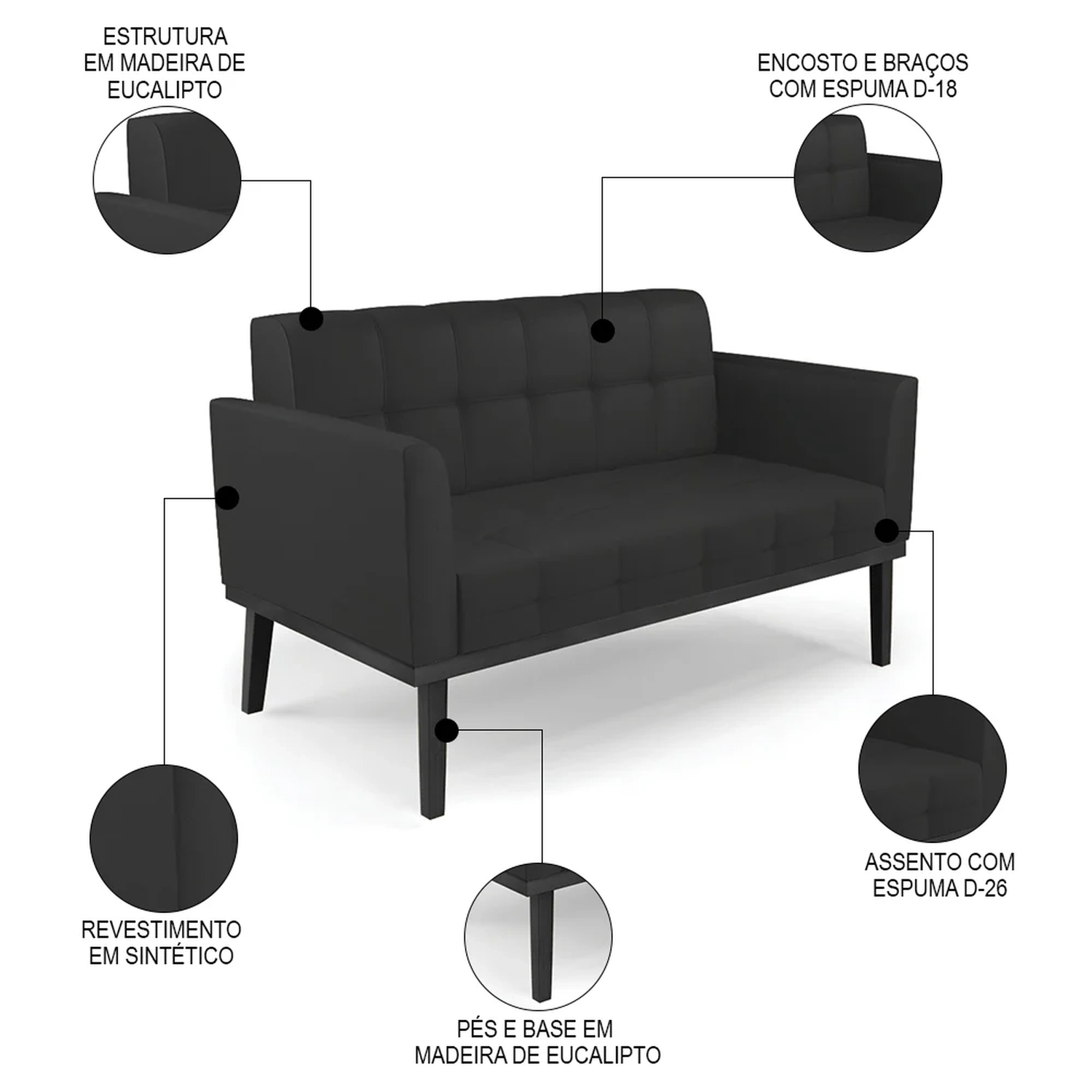 O Sofá Namoradeira e a Poltrona Decorativa são revestidos em sintético, que é fácil de limpar e valoriza o design das peças. Eles têm braços e encosto em espuma D-18 e assento em espuma D-26, que oferecem firmeza e aconchego para você relaxar. A base em madeira de eucalipto Preto é um detalhe charmoso, que dá um toque rústico e sofisticado ao conjunto. O kit tem uma estrutura resistente e suporta até 120 kg cada peça. A montagem é simples, pois as peças já vêm prontas, bastando fixar a base com os parafusos que acompanham o produto. A limpeza é prática, pois basta usar um pano limpo e levemente úmido, sem produtos abrasivos, para manter o seu kit sempre em bom estado. Hora de transformar seu ambiente com a Namoradeira 2 Lugares e a Poltrona para Sala deixando ainda mais confortável e estiloso.