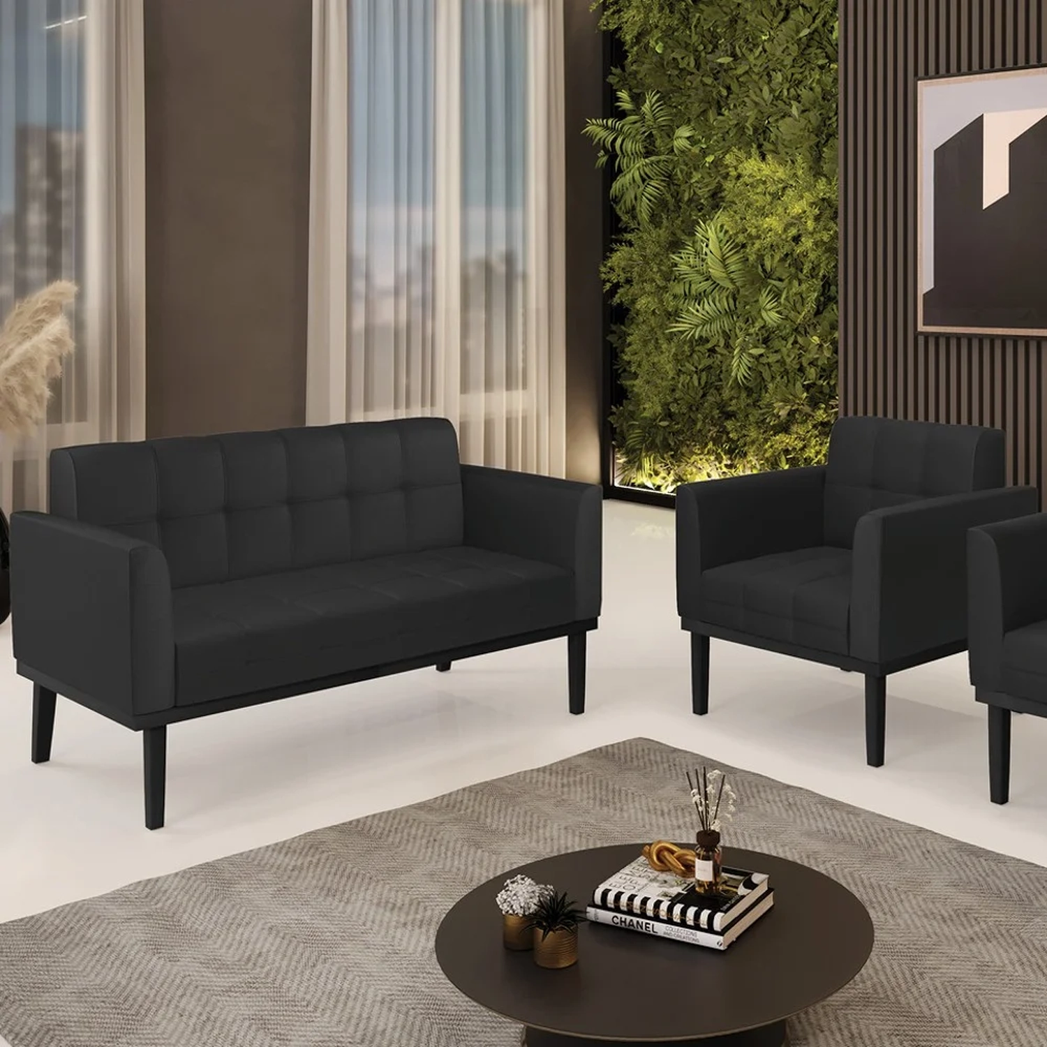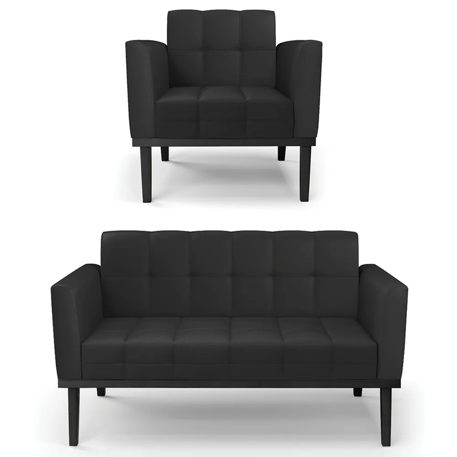 O Sofá Namoradeira e 1 Poltrona Base Madeira Preto Ana Sintético Preto, da Ibiza é o conjunto ideal para quem busca beleza, conforto e versatilidade. Você pode usar na sua Sala De Estar, recepção ou qualquer outro ambiente que desejar.